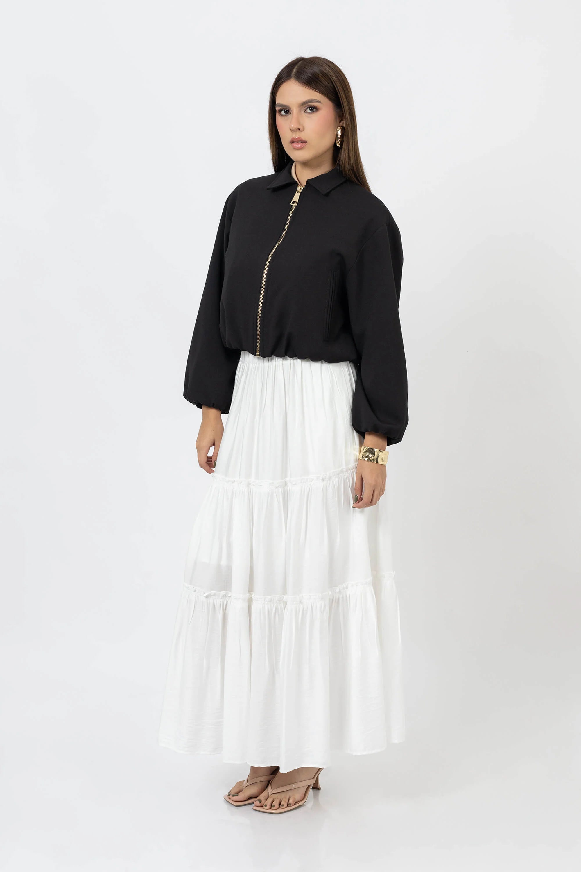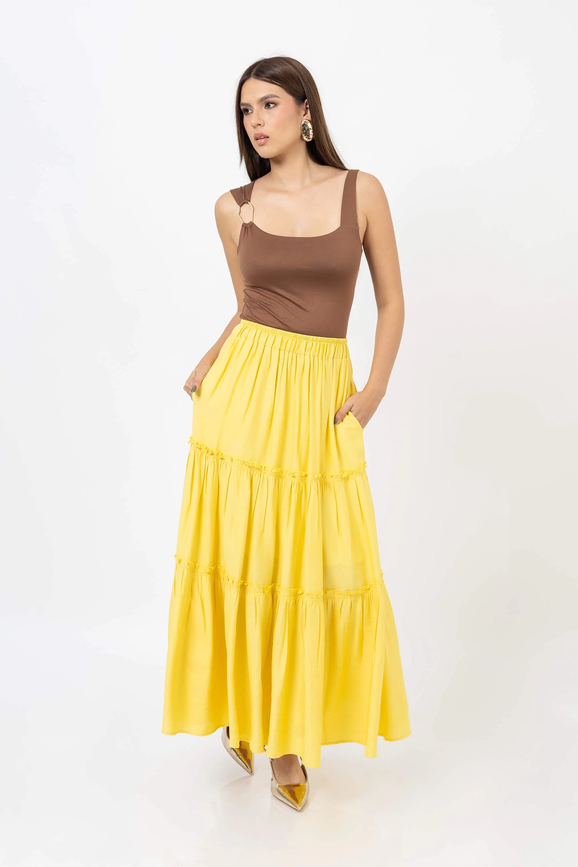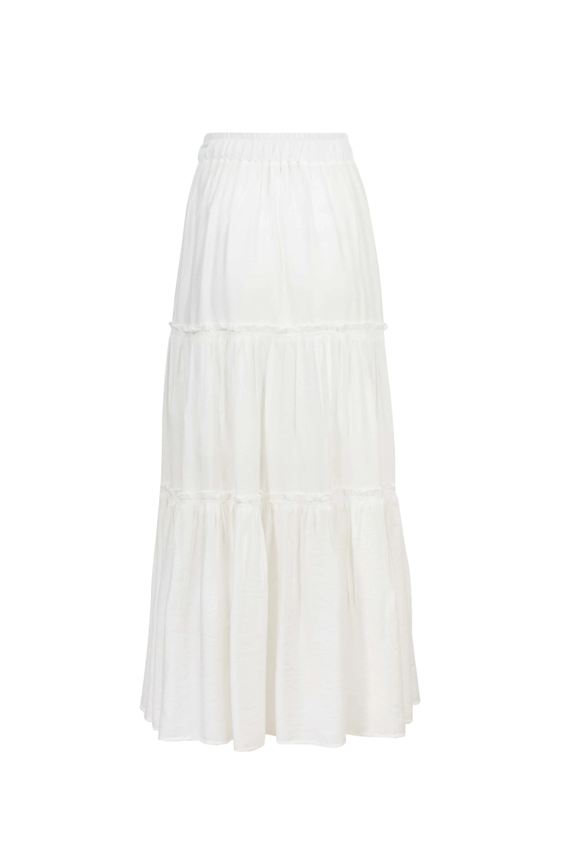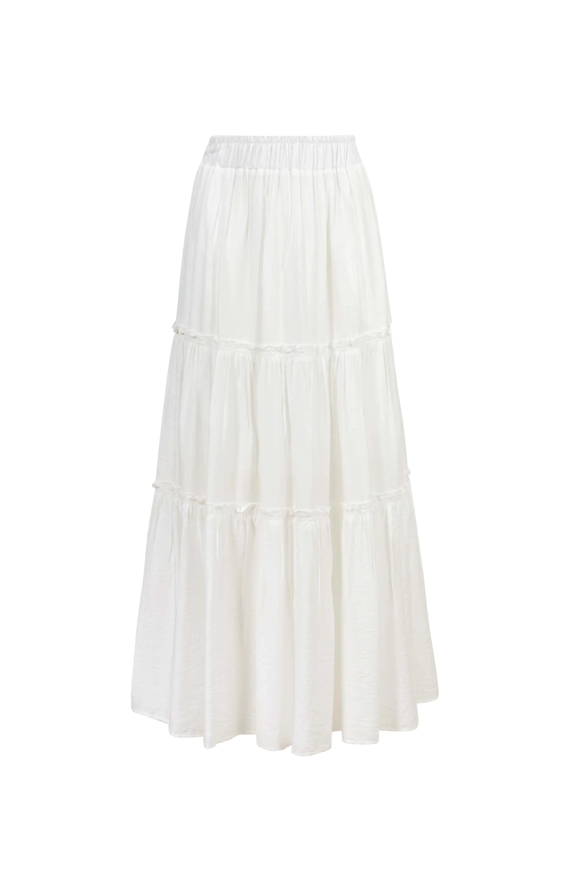 La falda Paige es una pieza de longitud maxi que destaca por su diseño de tres tiempos (tiered), creando una silueta fluida y con movimiento orgánico. Su estética bohemia se eleva mediante una construcción limpia y minimalista, con una cintura elástica fruncida que garantiza un ajuste cómodo y adaptable. Los cortes horizontales están decorados con pequeños volantes sutiles que añaden textura y detalle sin comprometer la ligereza visual de la prenda.