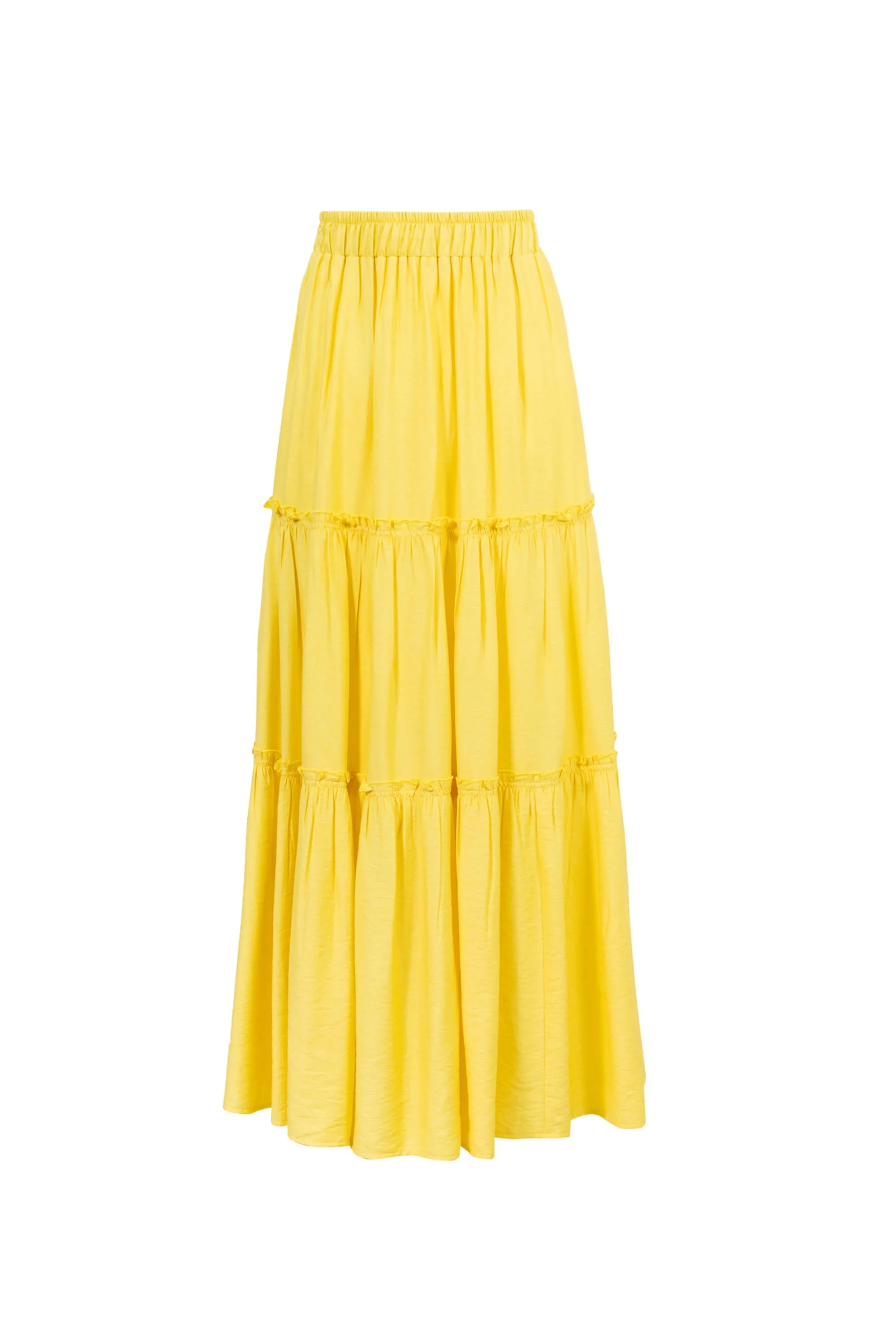 Esta falda está confeccionada en una mezcla premium de 90% Rayón y 10% Nylon. Esta composición es clave para su desempeño: el rayón otorga una mano ultra suave y una caída líquida, mientras que el nylon aporta resistencia estructural y un sutil brillo satinado que captura la luz con elegancia. La manufactura técnica incluye costuras reforzadas en cada nivel y un acabado de dobladillo fino que mantiene la vaporosidad del tejido en el ruedo.