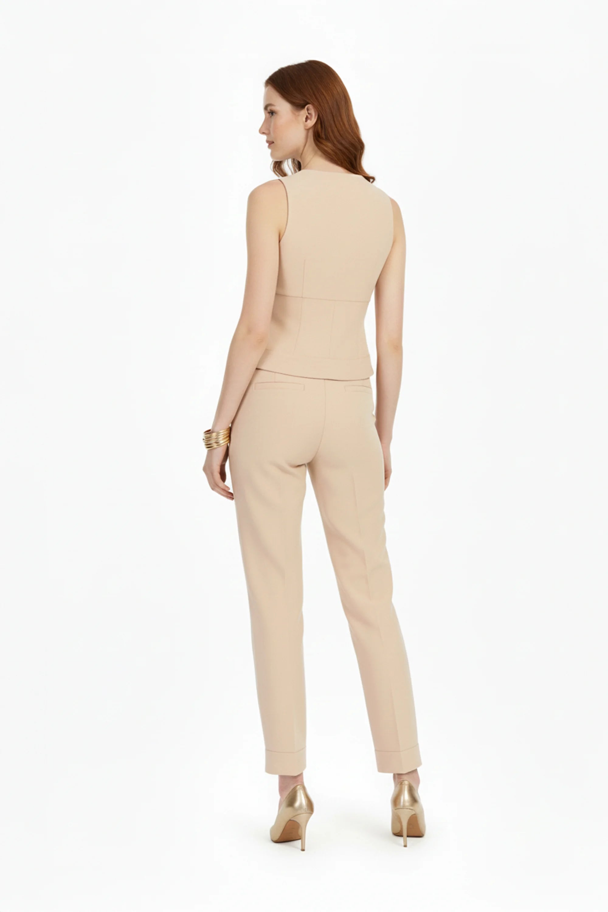 Este pantalón de poliéster combina confort, elegancia y un diseño atemporal. Su corte recto y cintura alta esculpen visualmente la figura y alargan las piernas, mientras que la textura del tejido aporta estructura sin sacrificar flexibilidad.