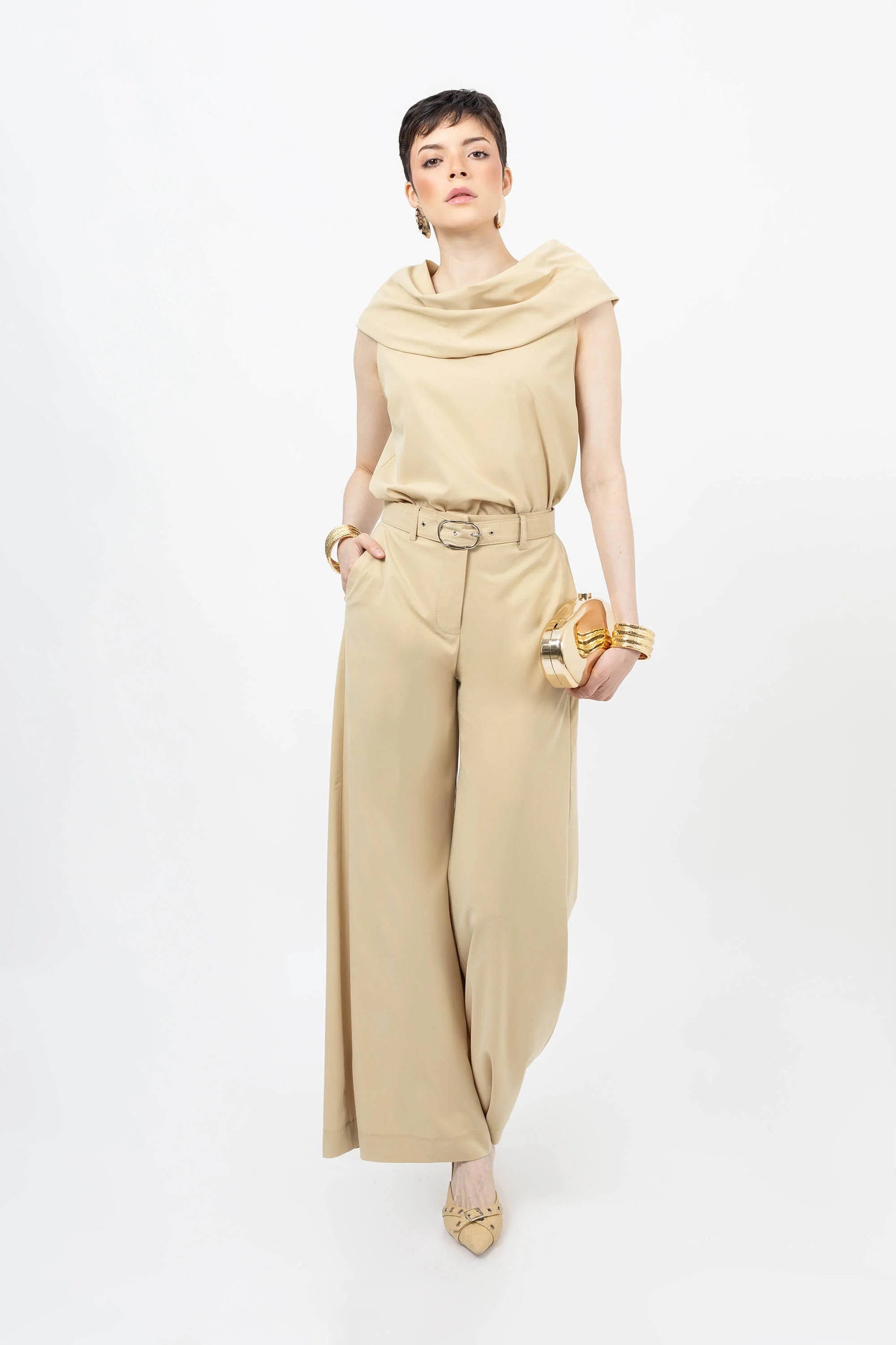 Luz, frescura y elegancia natural se expresan en este pantalón wide leg beige de Reina Díaz. Su tiro alto estiliza la cintura mientras que la pierna amplia crea una caída fluida que alarga visualmente la silueta, aportando un aire relajado pero sofisticado.