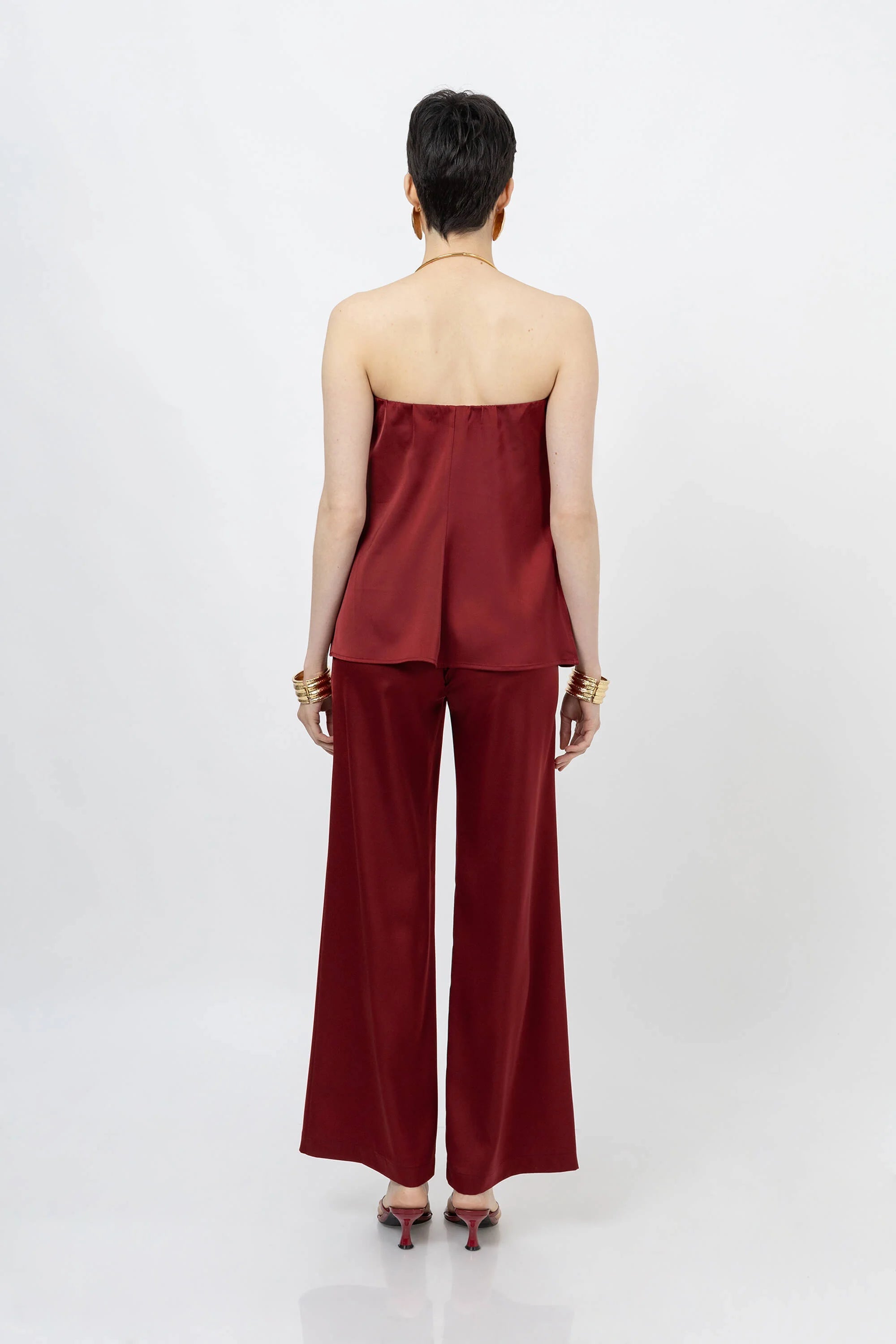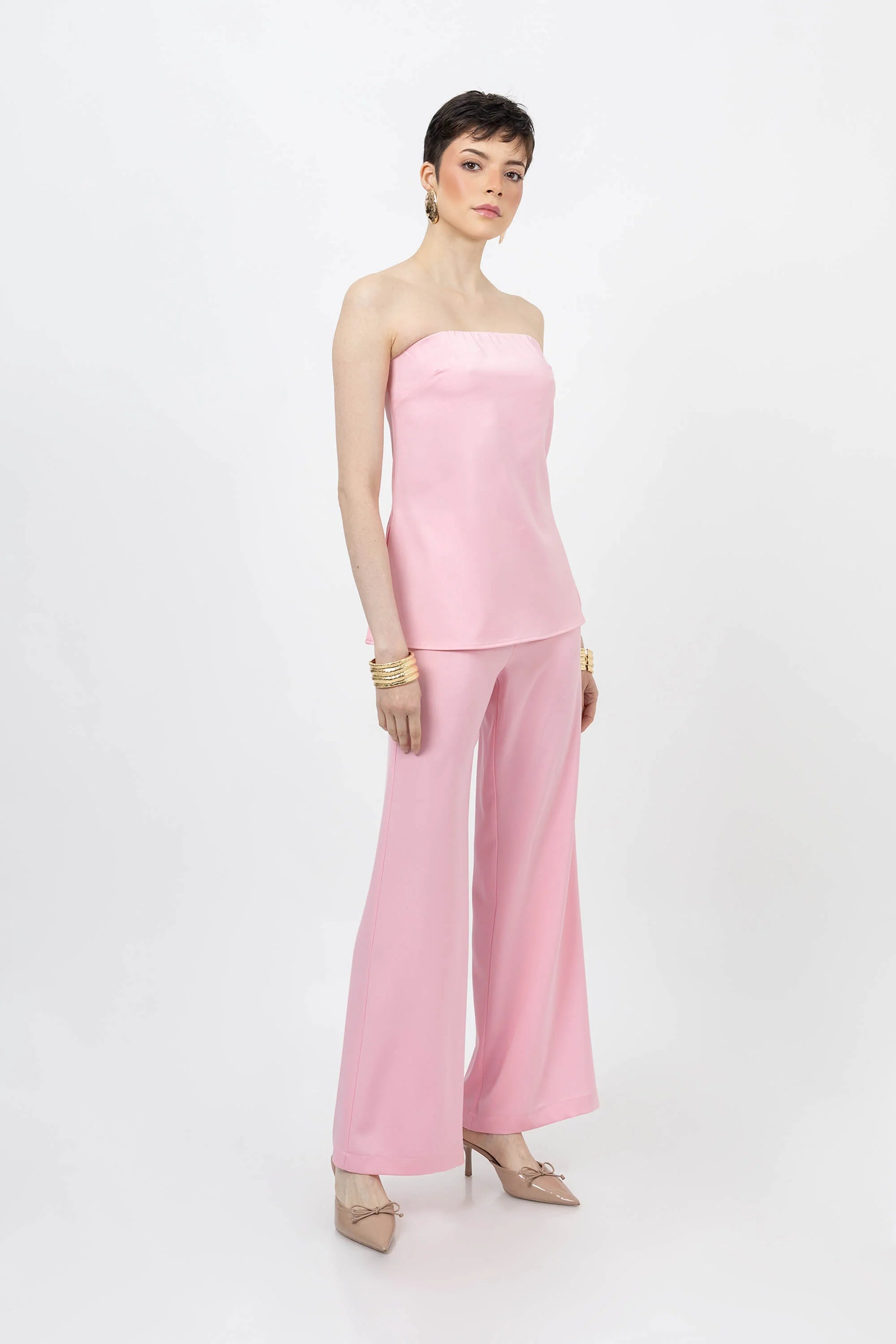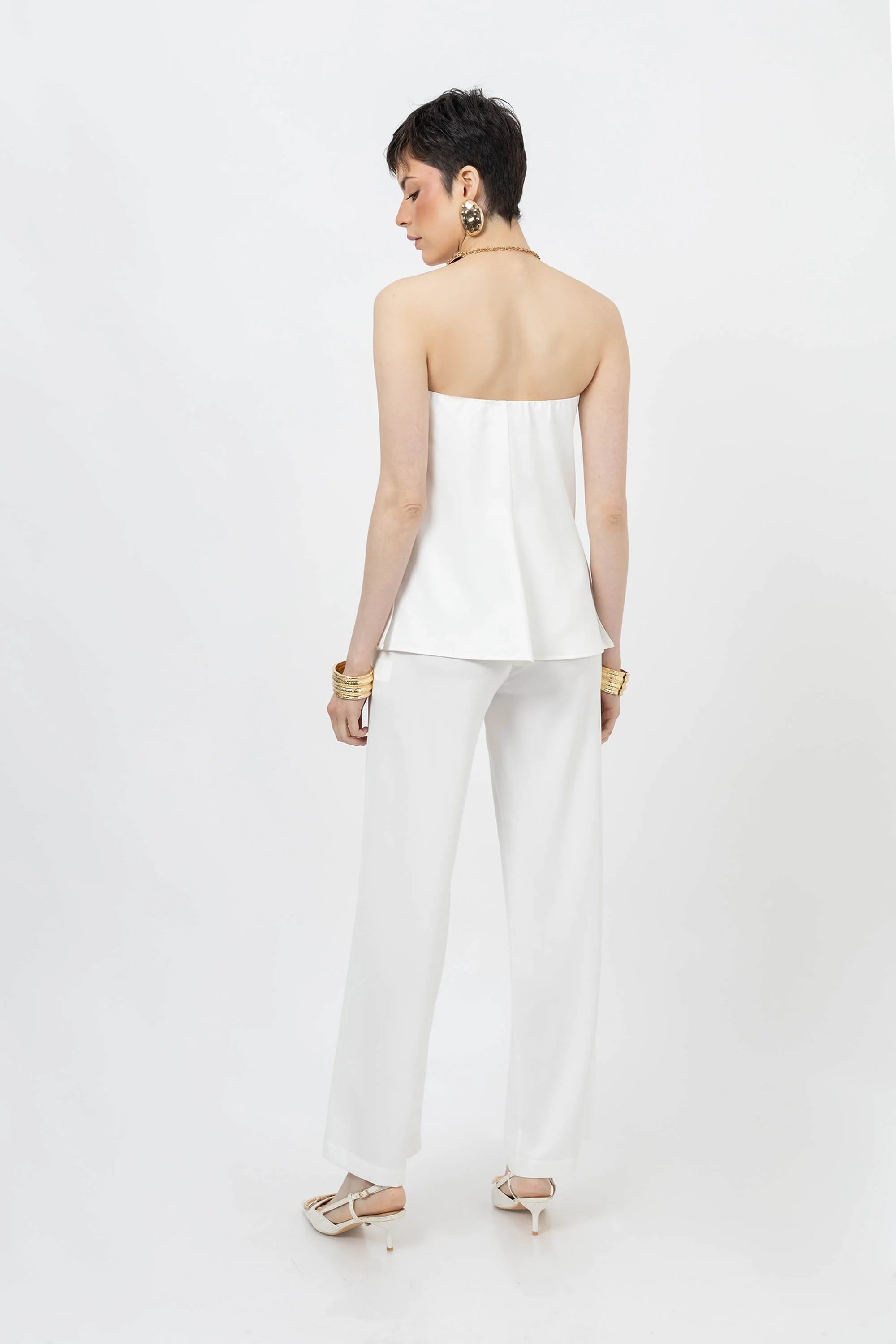 Equilibrio, estructura y elegancia moderna definen este pantalón de Poet Couture. Su diseño de tiro alto marca la cintura con sutileza, mientras que la pierna amplia crea una silueta fluida que estiliza la figura y aporta movimiento natural.