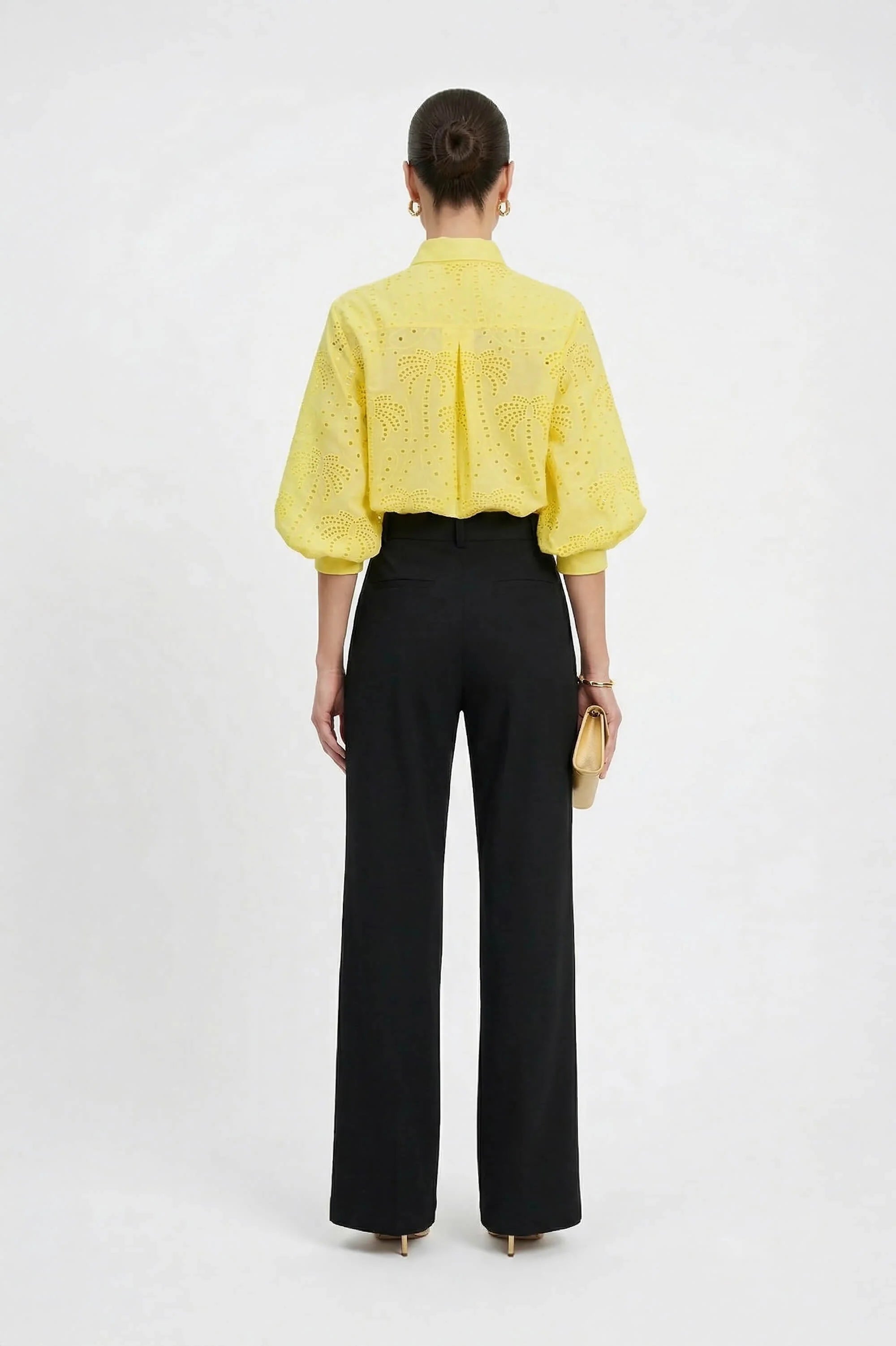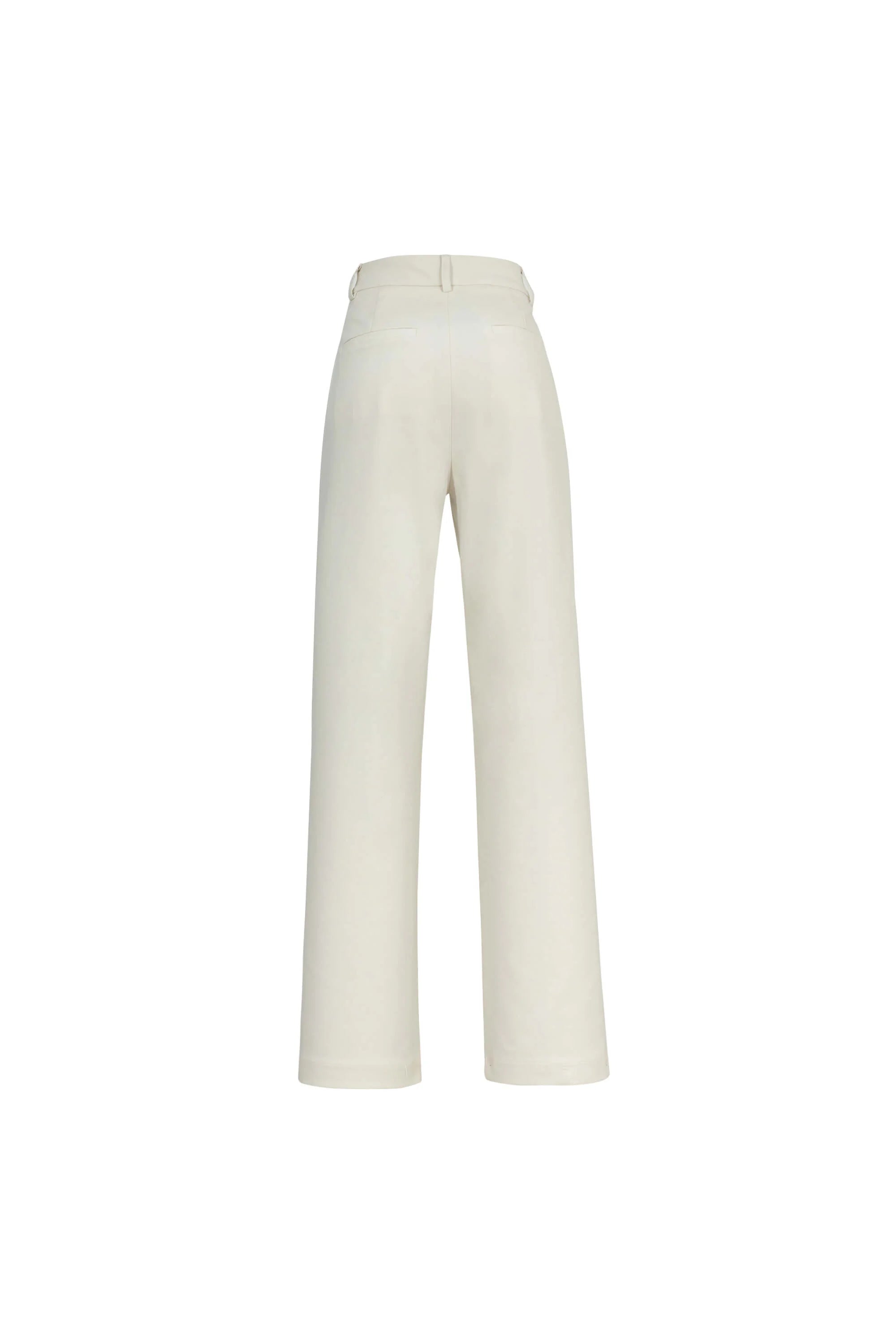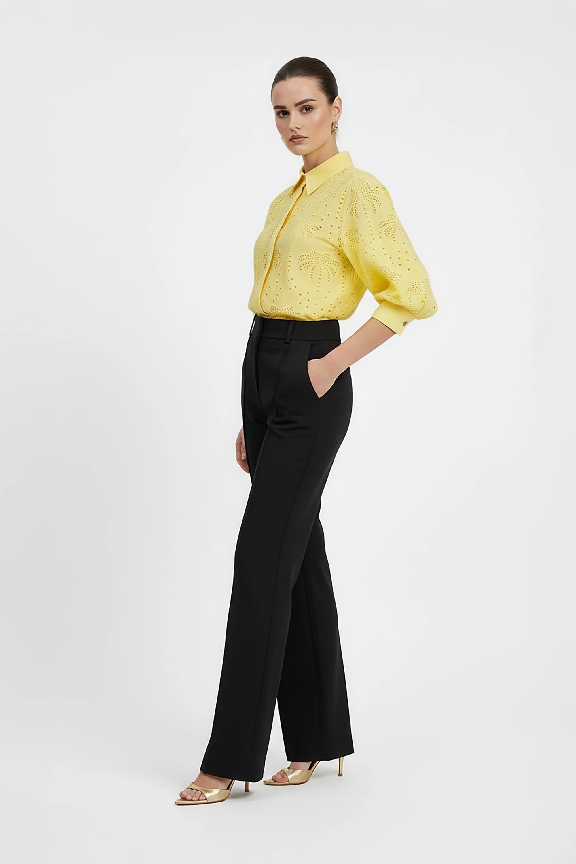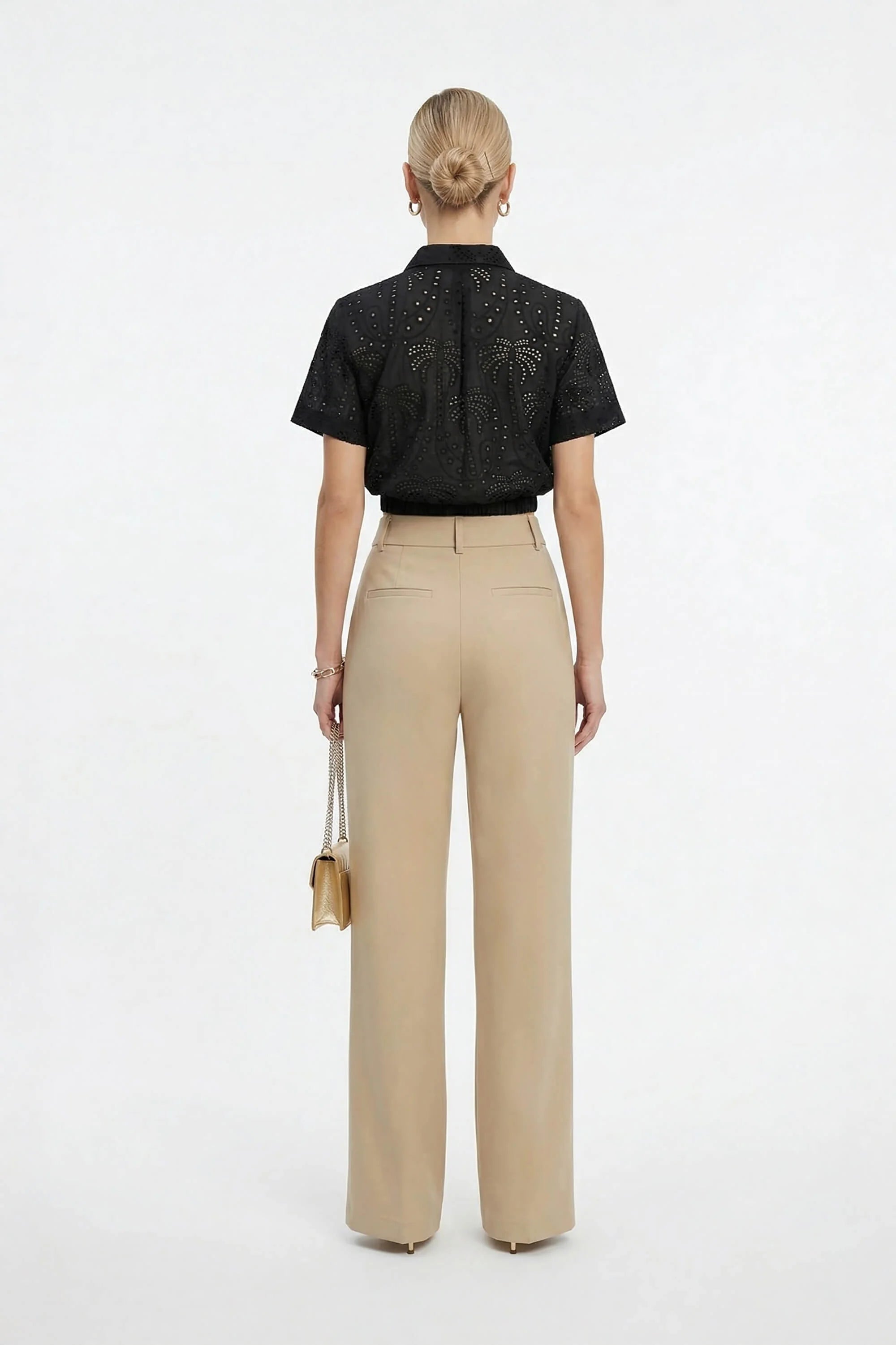 Su corte recto (straight fit) ofrece una silueta limpia que alarga visualmente las piernas, brindando comodidad sin perder estructura. El diseño de tiro medio a alto favorece la figura y aporta un ajuste cómodo y estilizado en la cintura.