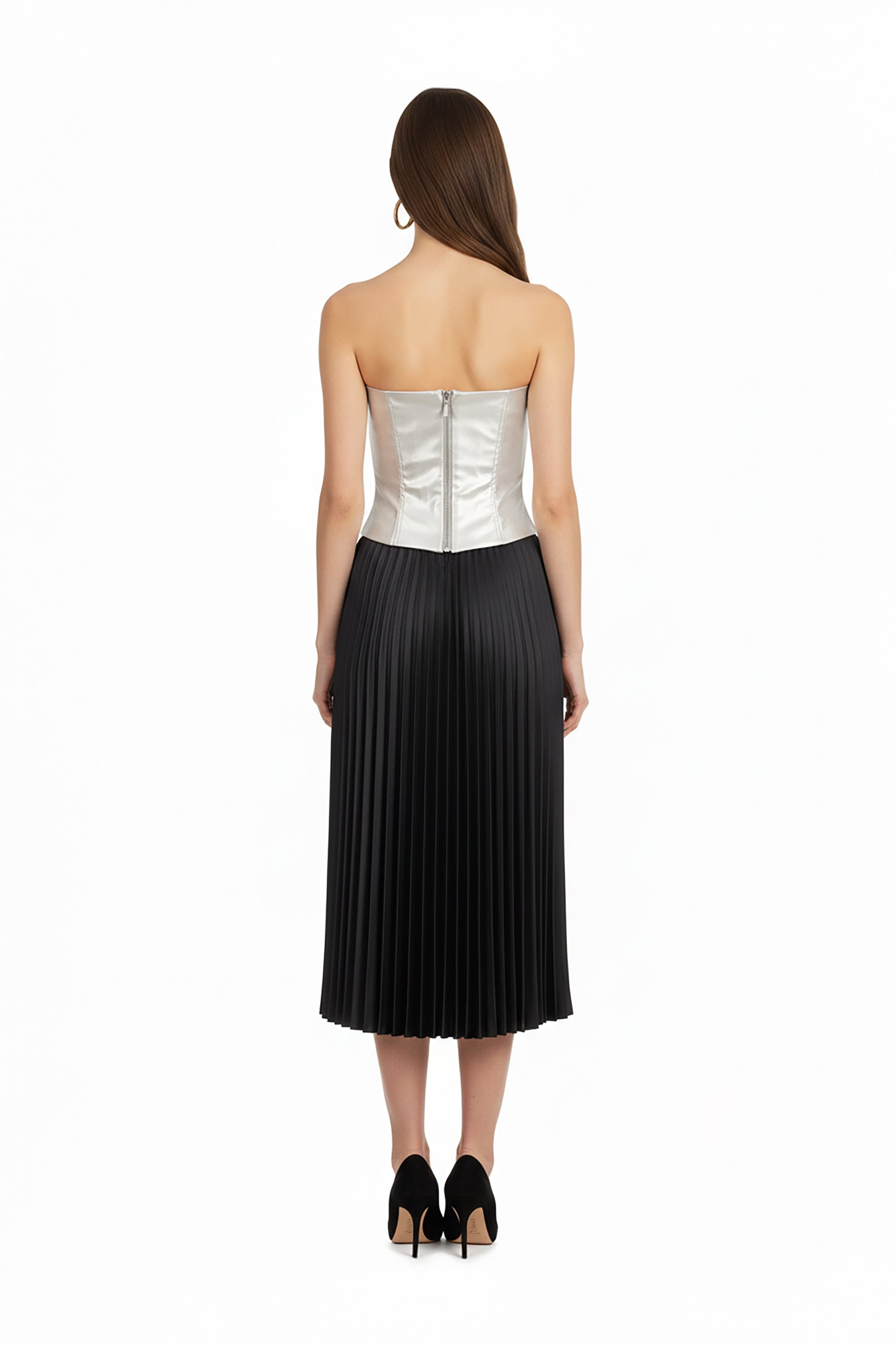 El modelo presenta una pretina lisa y ancha que enmarca la cintura con precisión, proporcionando un soporte estructurado antes de dar paso a la fluidez del plisado. Cuenta con una cremallera invisible lateral que garantiza un ajuste limpio y discreto. El corte de la falda ofrece un movimiento rítmico al caminar, mientras que el forro interno ligero asegura comodidad y una caída perfecta sin añadir volumen innecesario.