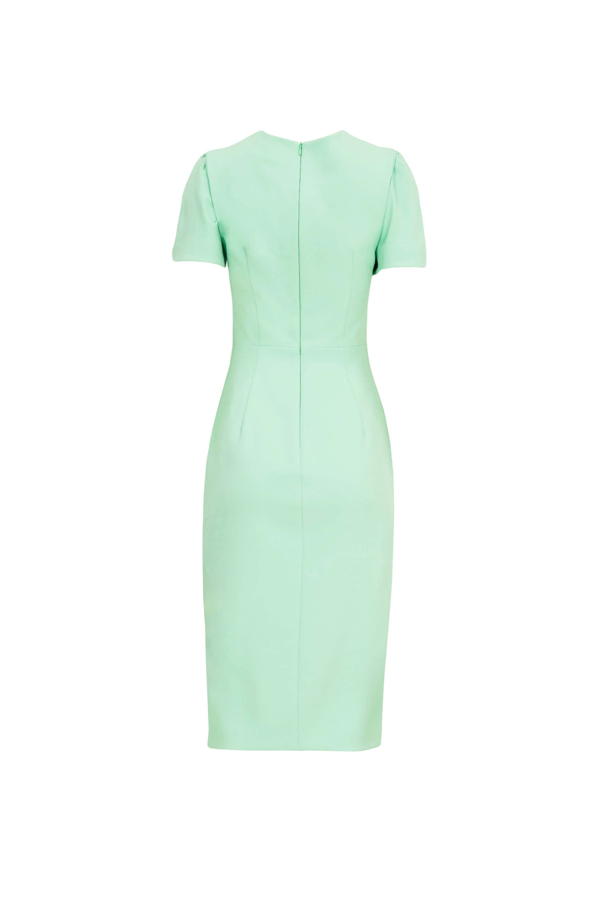 Este vestido de corte vaina (sheath) destaca por su impecable escote cuadrado, que aporta una estructura limpia y contemporánea al busto. El punto focal de la prenda es un sofisticado detalle de nudo lateral en la cintura, del cual nace un delicado drapeado que fluye de forma asimétrica por el torso, estilizando la silueta con una elegancia arquitectónica. Presenta mangas cortas con un ligero volumen y pinzas en los hombros que refuerzan su carácter estructurado y refinado.