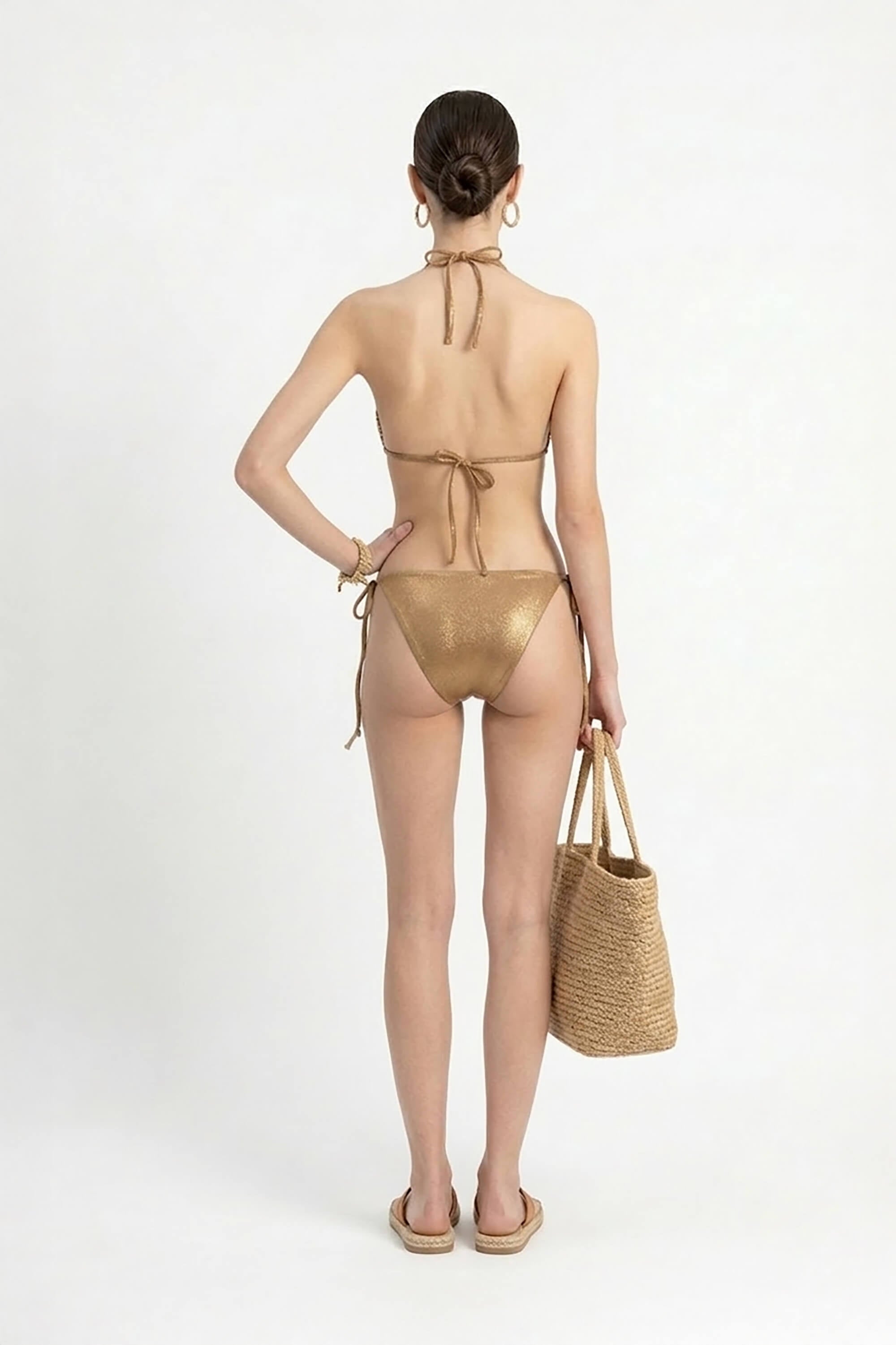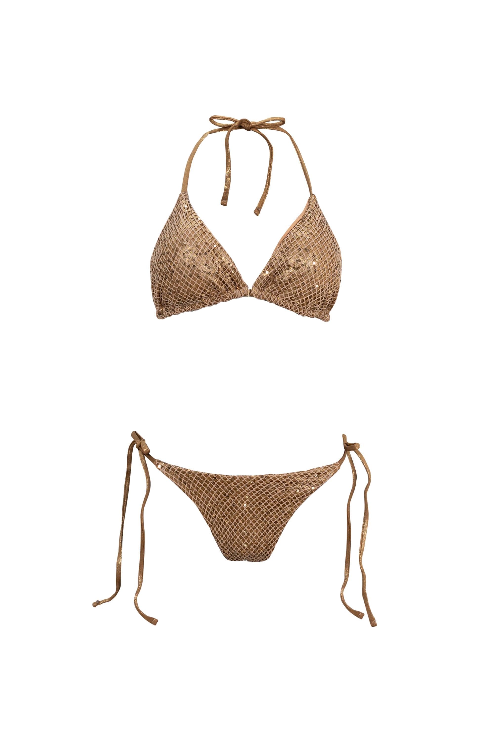 Este conjunto de bikini representa la sofisticación brillante y el lujo de alta visibilidad. El top presenta una silueta de triángulo clásico con copas que ofrecen una cobertura ajustable. La braguita es de estilo low-rise (tiro bajo) con lazadas laterales, permitiendo un ajuste perfecto a la cadera. Su color bronce metálico, potenciado por el brillo de las lentejuelas, está diseñado para capturar la luz solar y resaltar el bronceado con un efecto radiante.