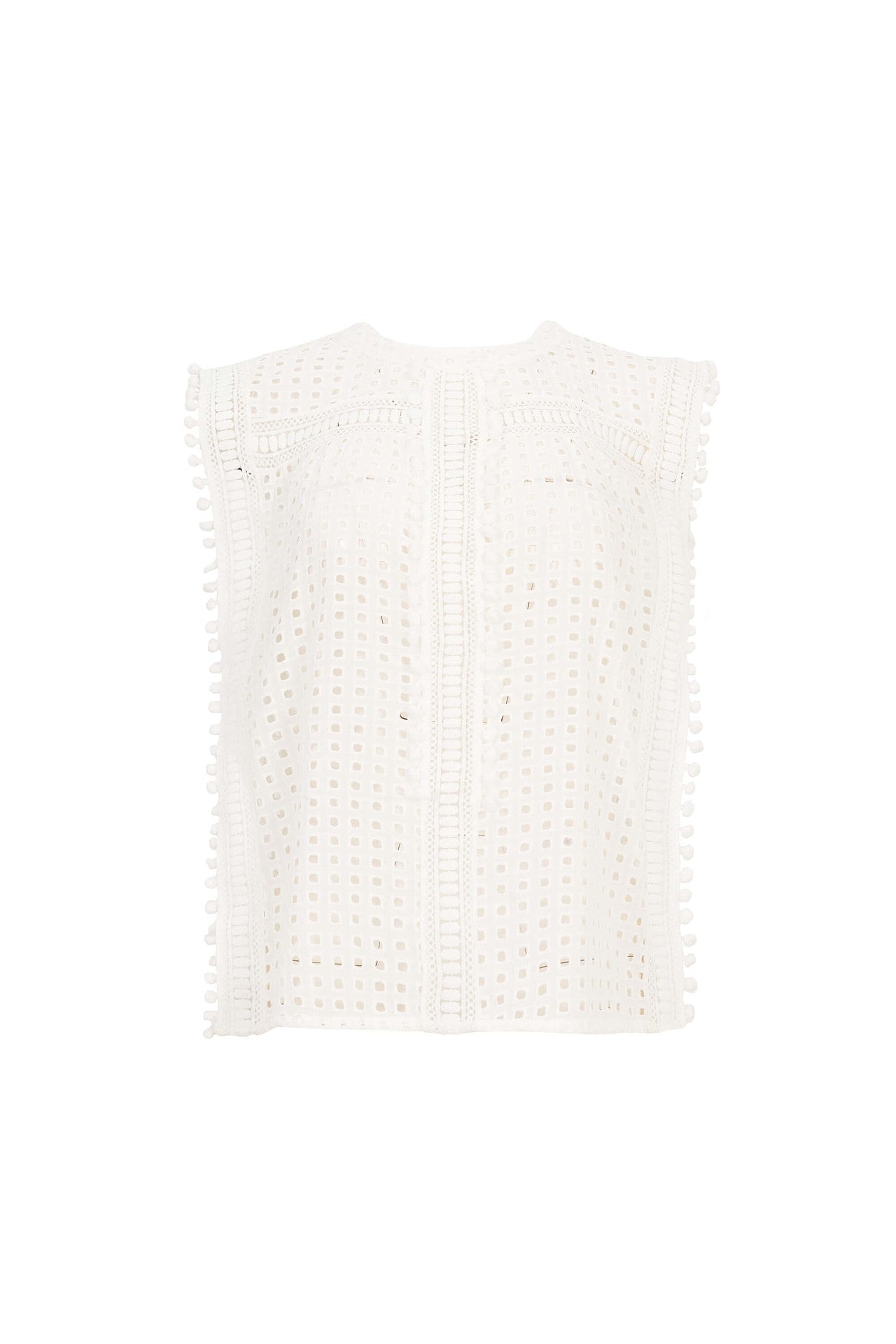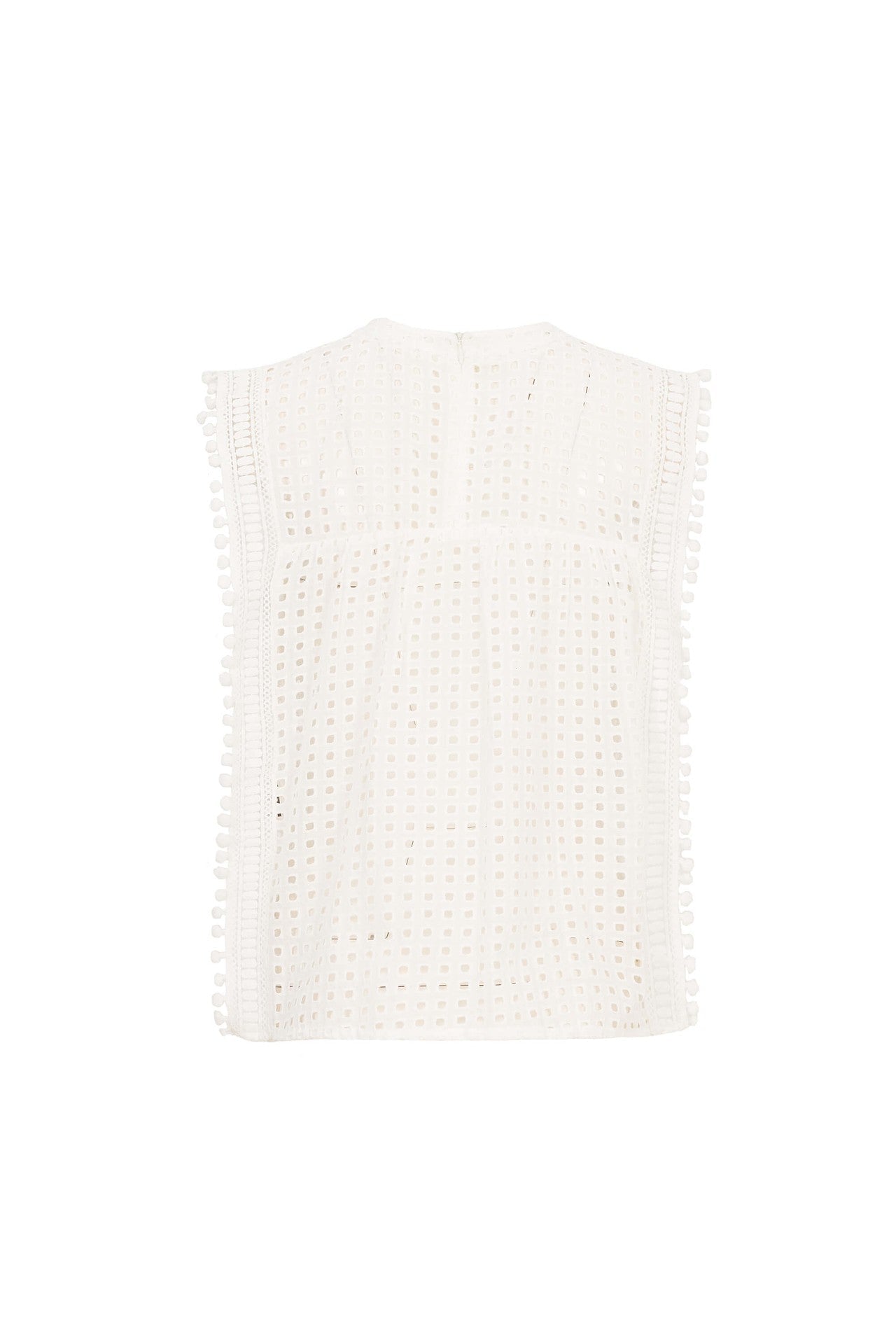 Esta blusa destaca por su sofisticada confección en bordado suizo (eyelet), que presenta un patrón geométrico calado para una ventilación y textura superiores. El diseño se caracteriza por su cuello redondo minimalista y una pechera central ornamentada con delicadas jaretas (pintucks) verticales y pasamanería de mini pompones, que aportan un relieve lúdico y artesanal al torso. Su silueta sin mangas se acentúa con ribetes de pompones en las sisas, proyectando una imagen de frescura absoluta y elegancia bohemia.