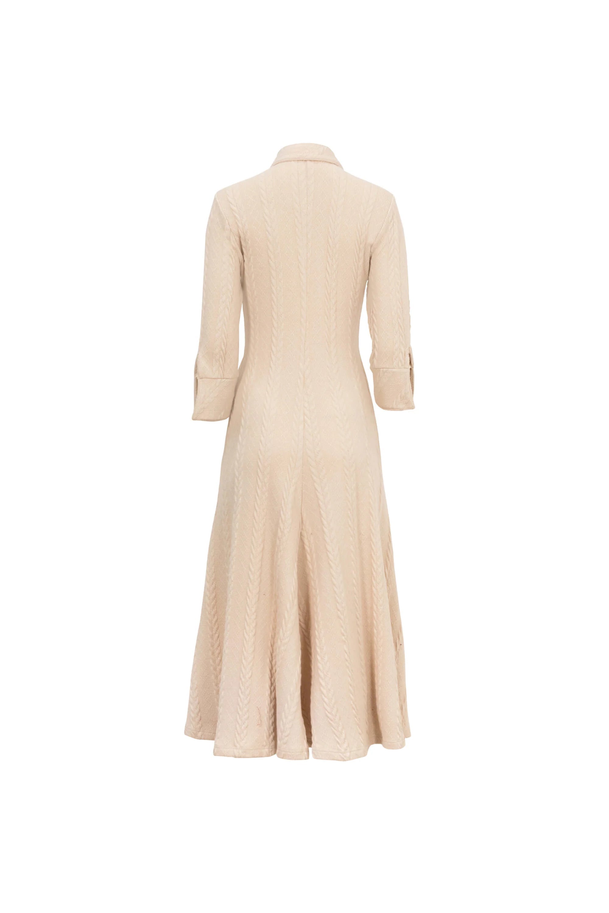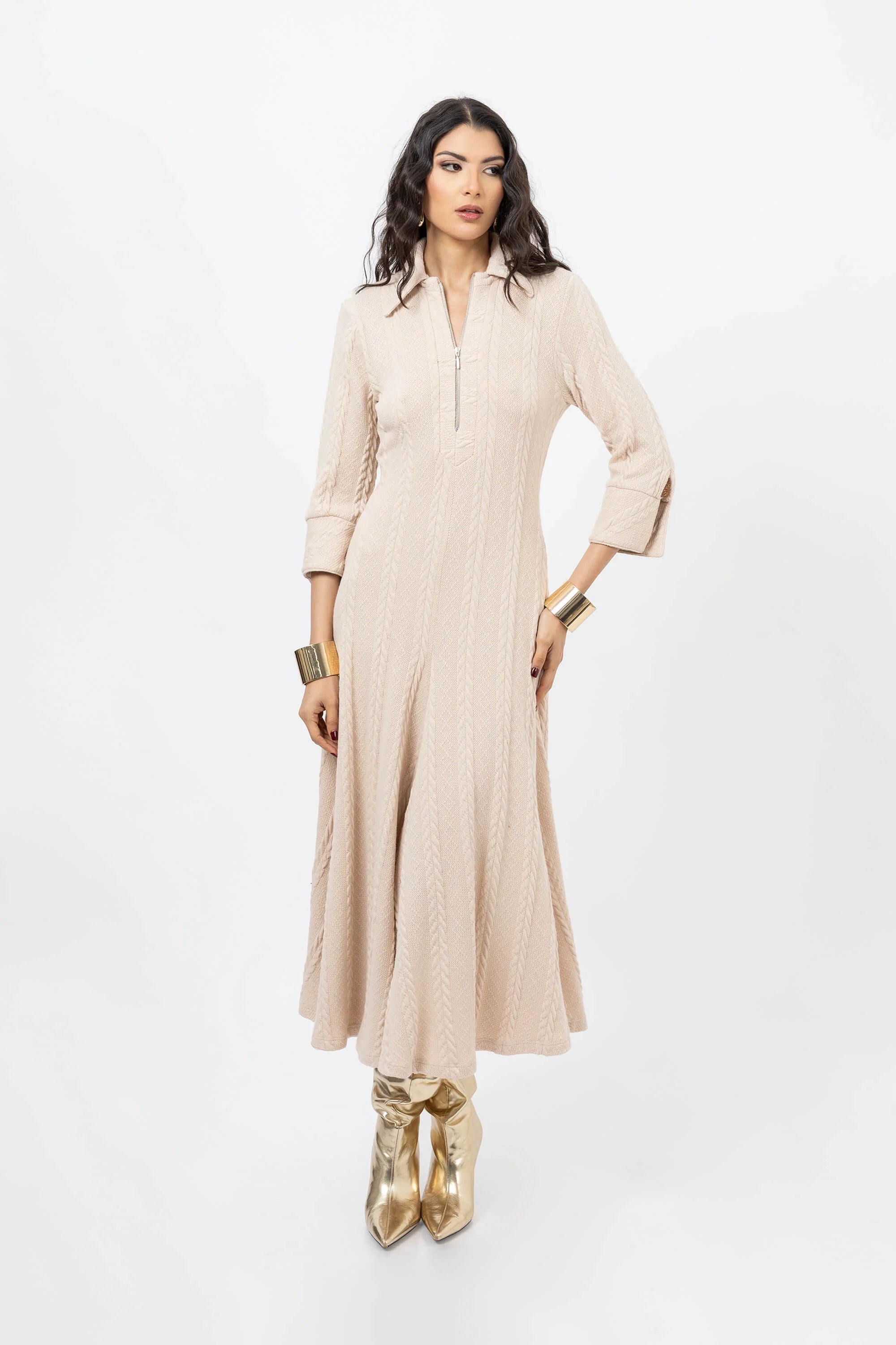 Este vestido midi destaca por su diseño de inspiración náutica y deportiva, presentando un cuello camisero estructurado y un cierre frontal de cremallera metálica que permite ajustar el escote. La silueta de línea A se ve realzada por un intrincado patrón de punto trenzado (cable knit) vertical que estiliza la figura, mientras que las mangas de longitud tres cuartos con puños definidos aportan un aire formal y refinado en un suave tono arena.