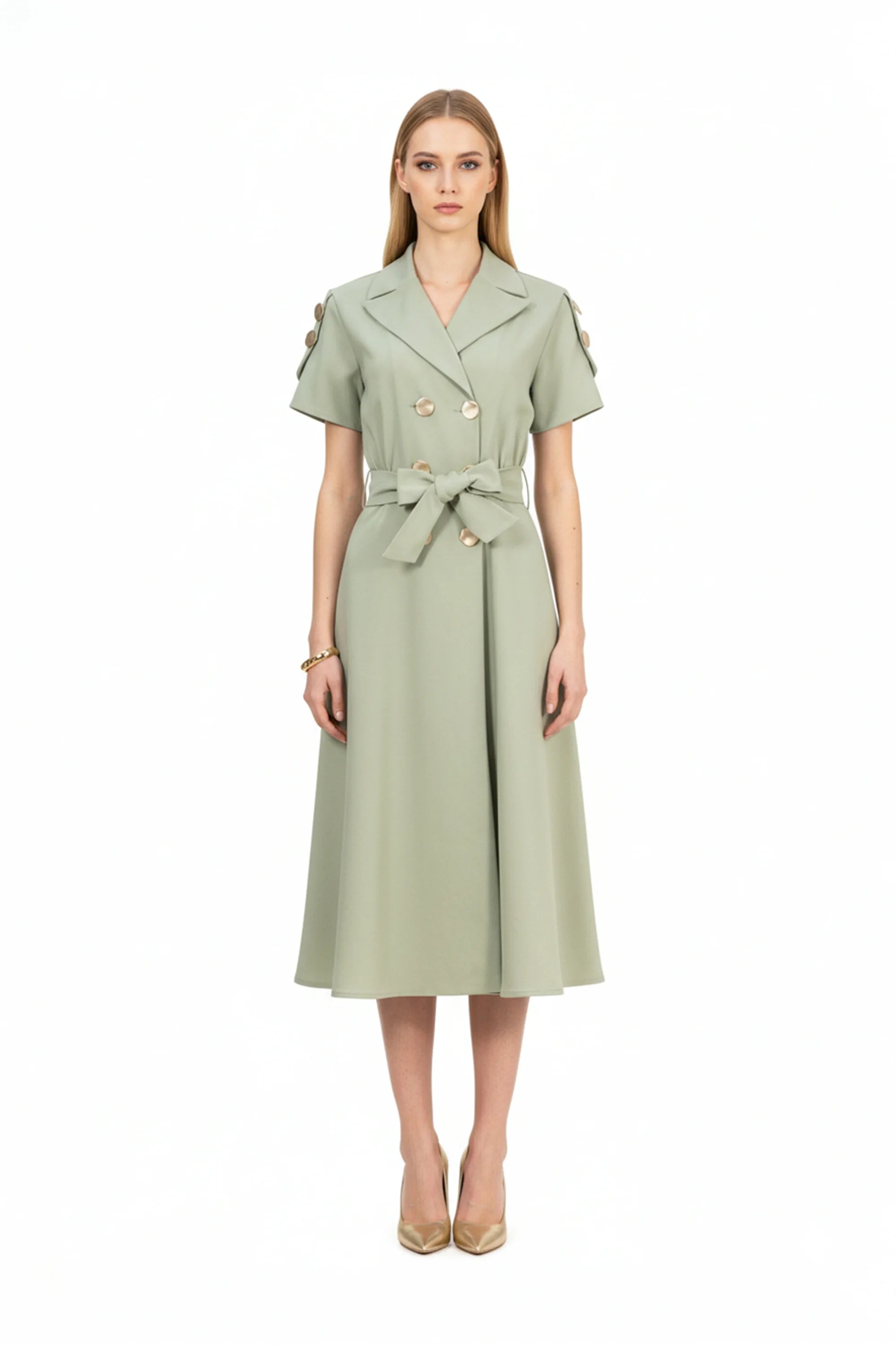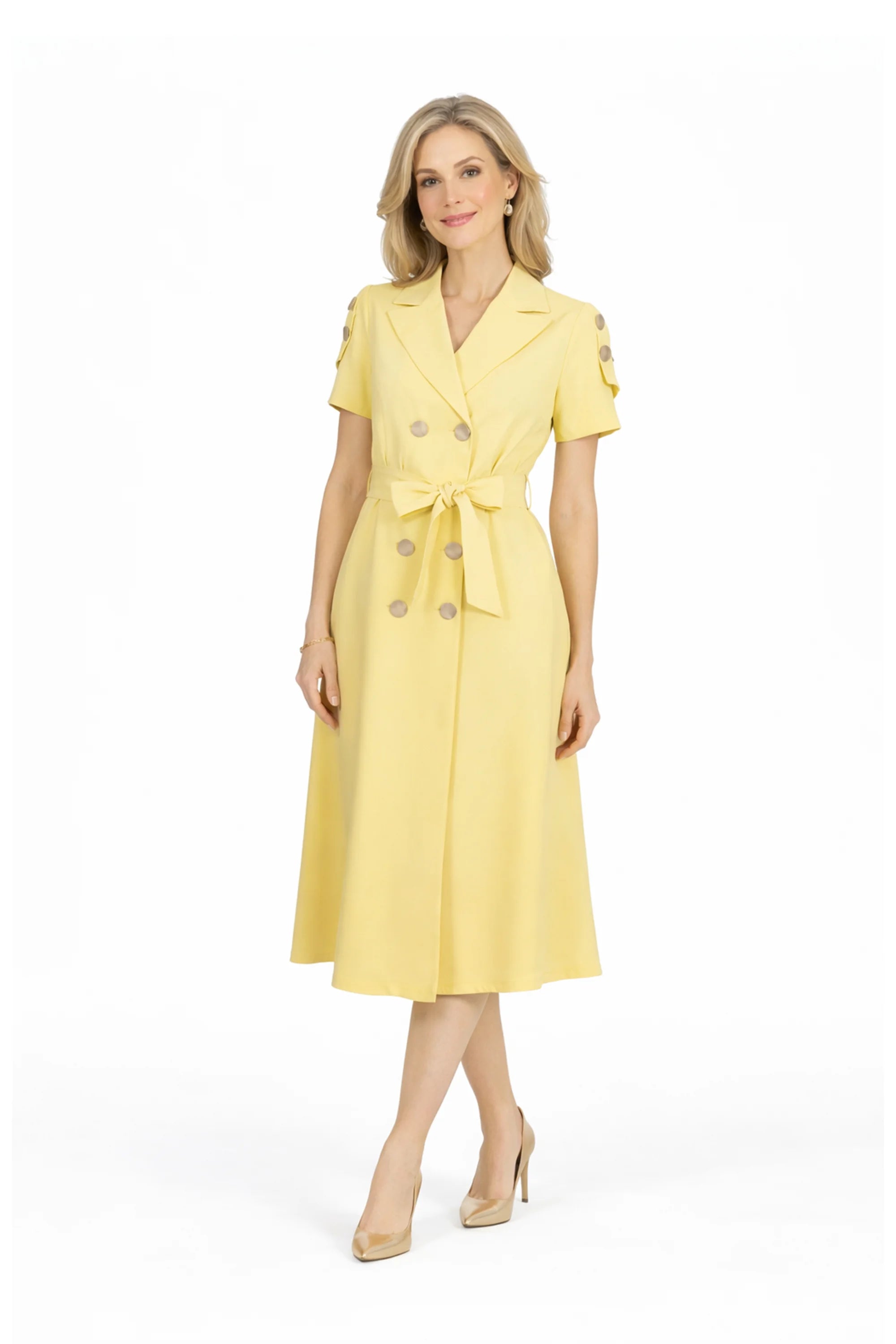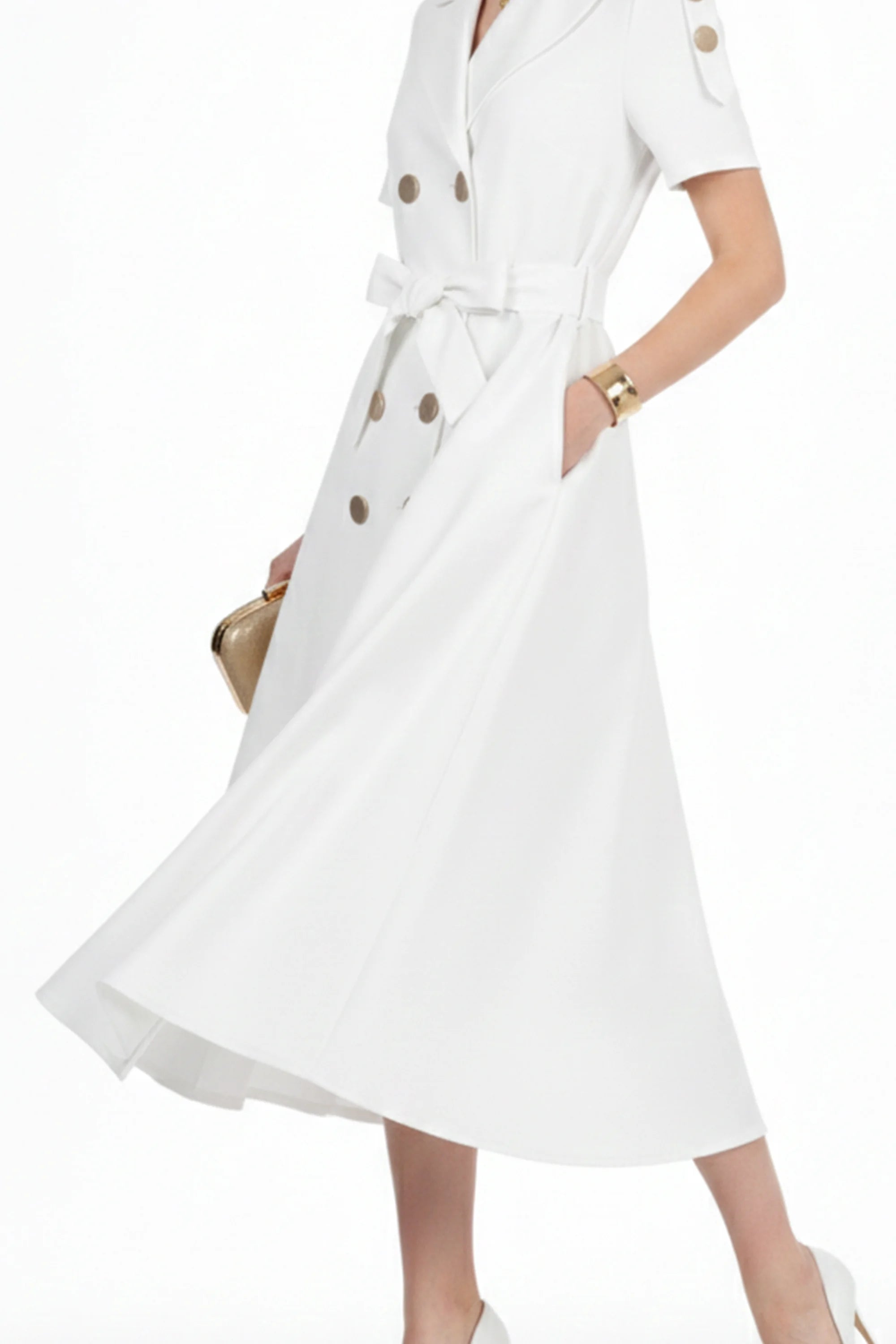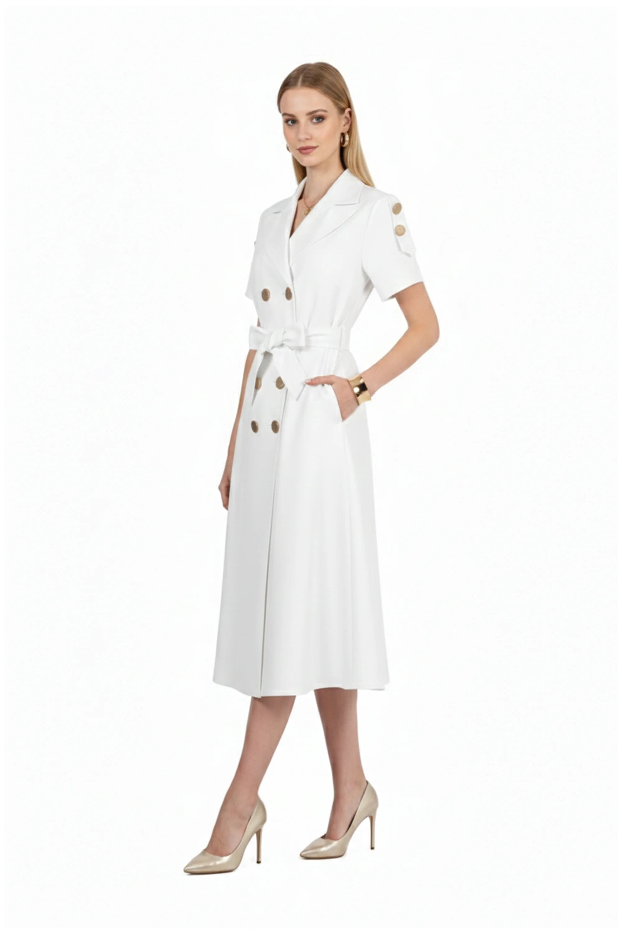 Este vestido destaca por su refinada silueta de inspiración trench, que incorpora un cuello de solapa clásico y un cierre frontal cruzado de doble botonadura. El punto focal de diseño es su exclusiva botonadura de herraje dorado, presente tanto en el torso como en los detalles de las mangas, aportando un contraste de lujo y un carácter ejecutivo a la prenda. Se caracteriza por un cinturón a juego con lazada, diseñado para ceñir la cintura y dar paso a una falda midi de línea A con un vuelo estructurado y profesional.