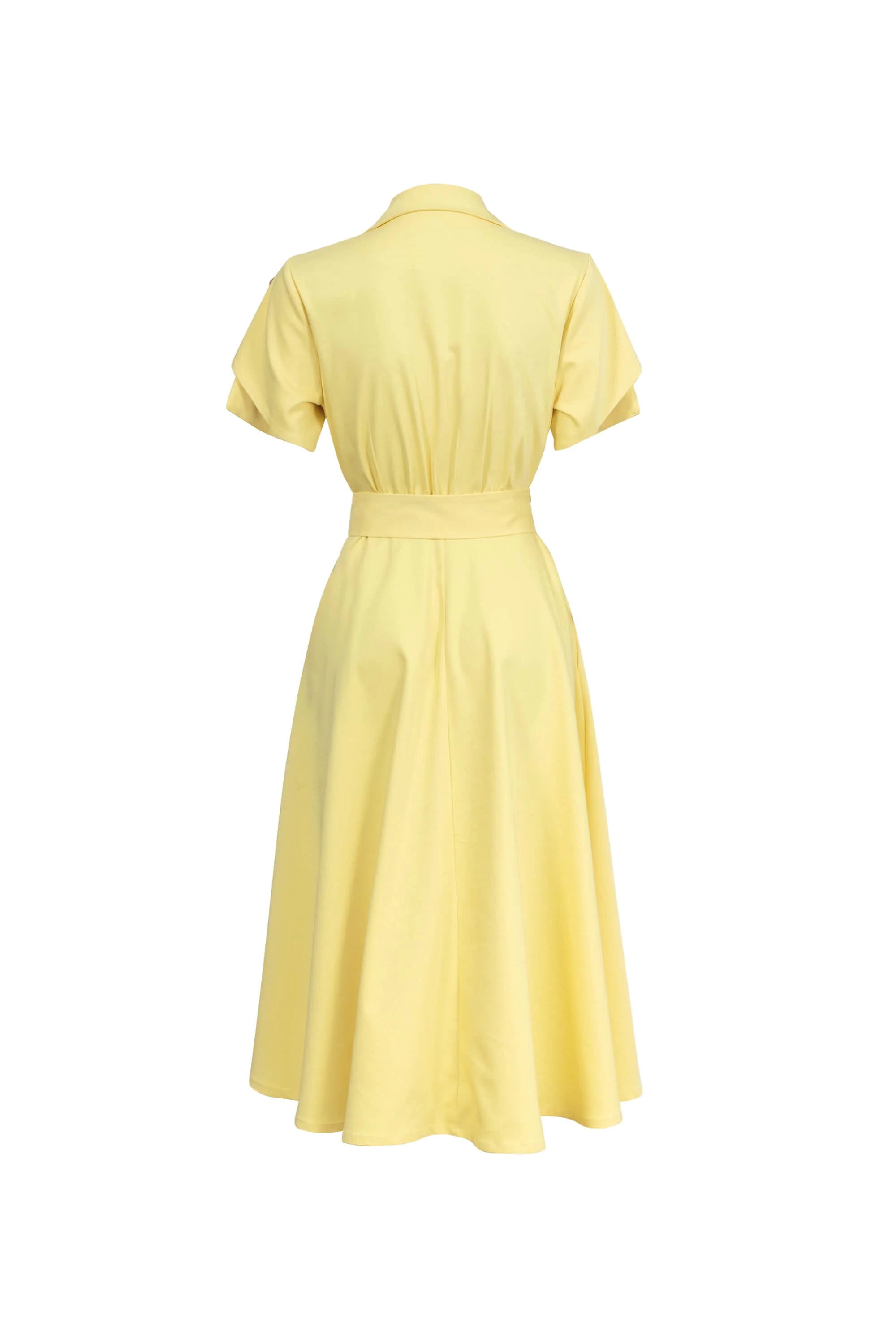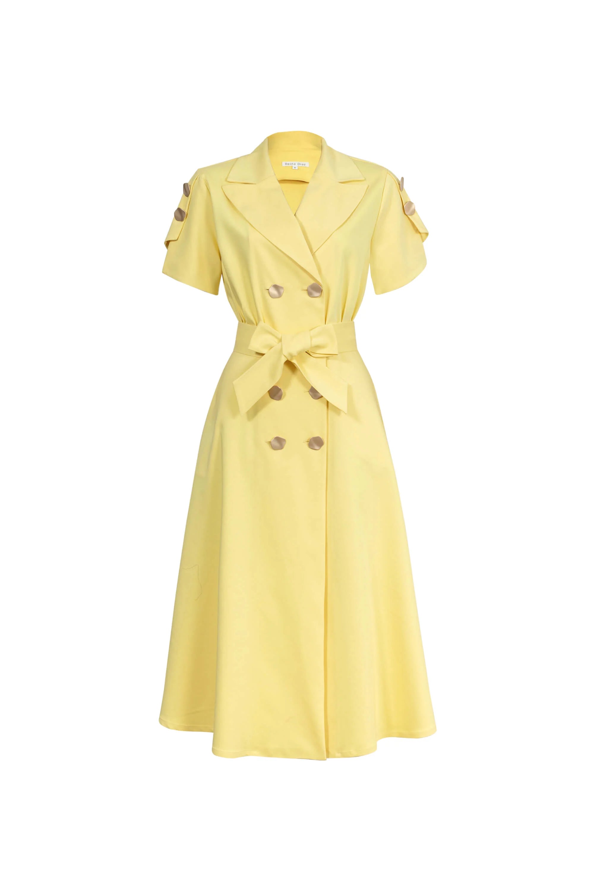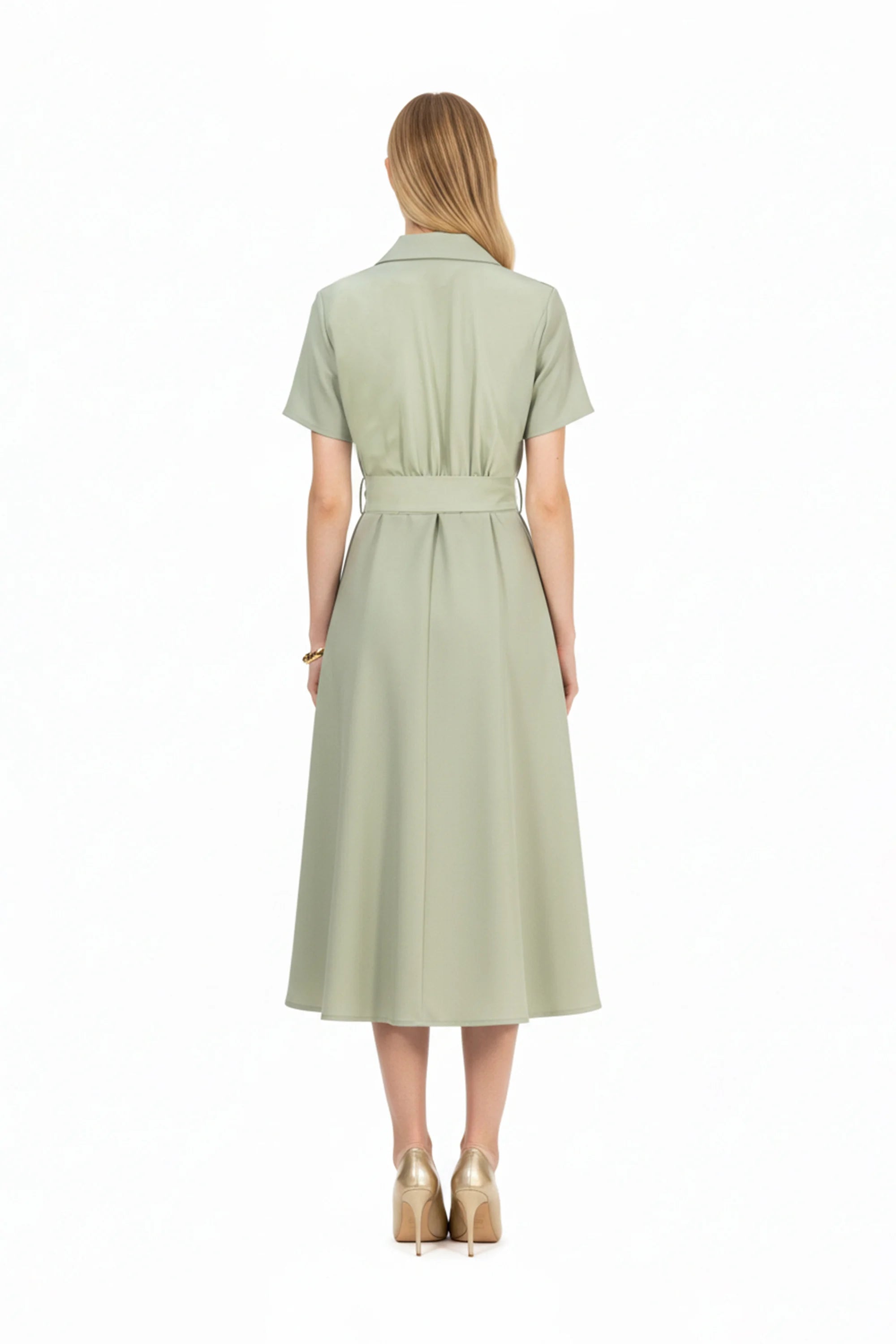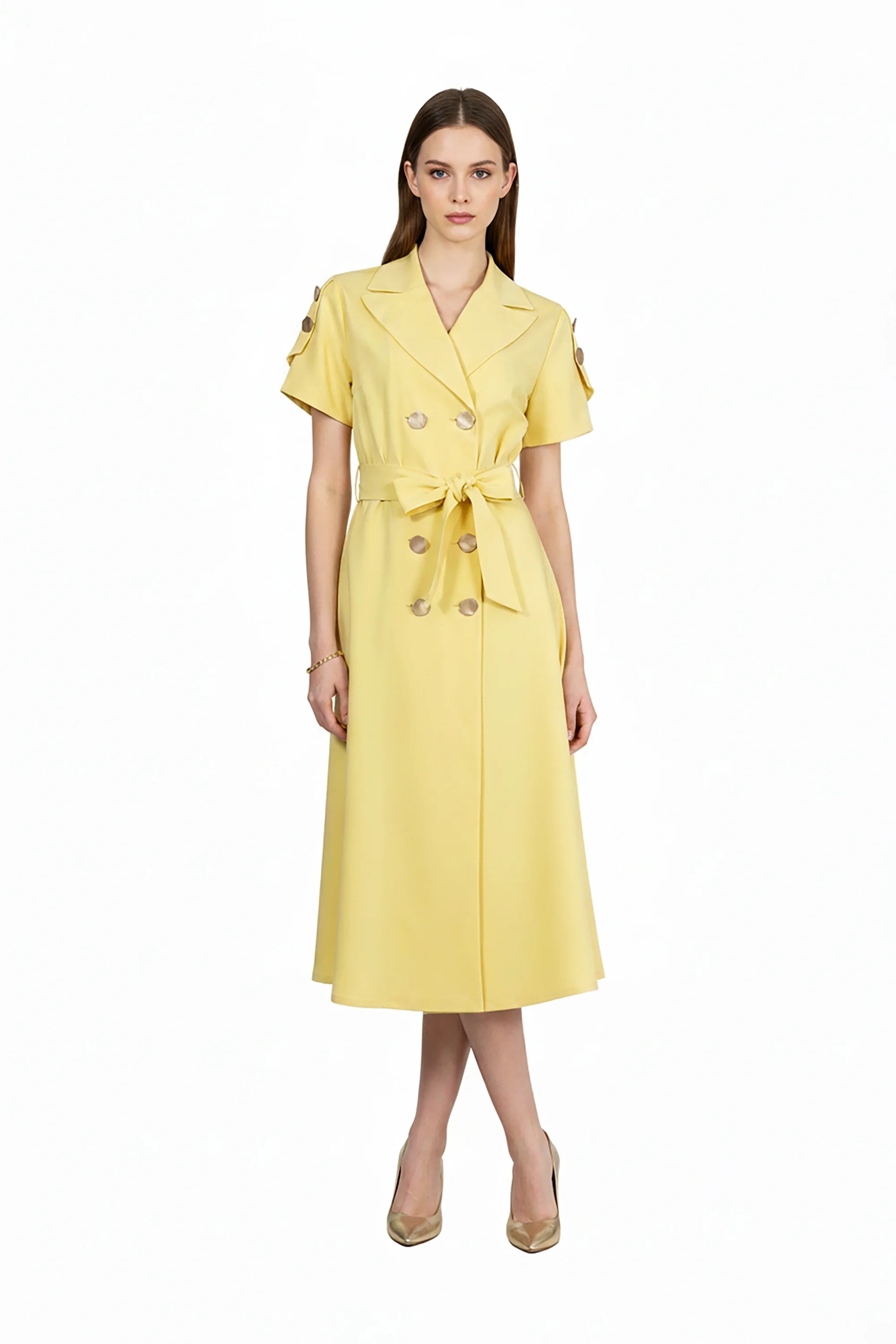 Este vestido destaca por su refinada silueta de inspiración trench, que incorpora un cuello de solapa clásico y un cierre frontal cruzado de doble botonadura. El punto focal de diseño es su exclusiva botonadura de herraje dorado, presente tanto en el torso como en los detalles de las mangas, aportando un contraste de lujo y un carácter ejecutivo a la prenda. Se caracteriza por un cinturón a juego con lazada, diseñado para ceñir la cintura y dar paso a una falda midi de línea A con un vuelo estructurado y profesional.