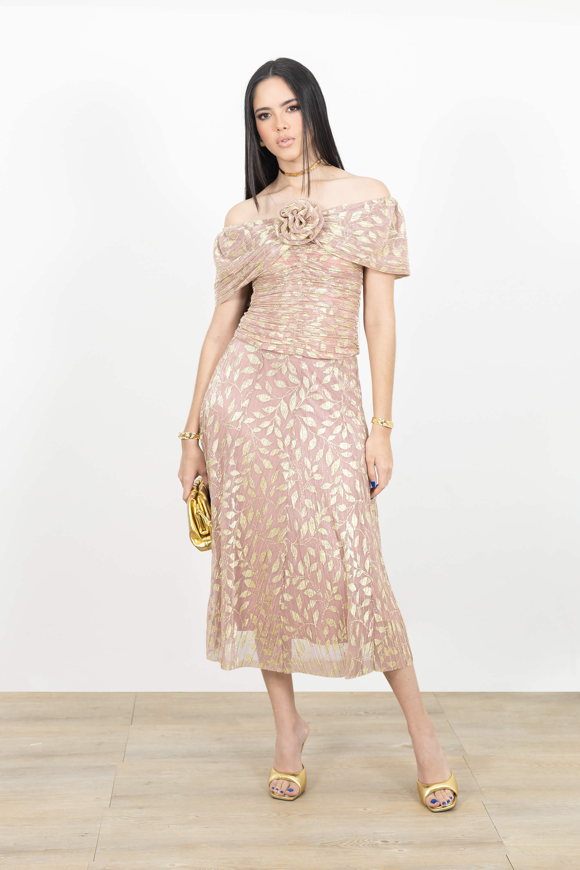 Este top destaca por su refinada silueta de hombros caídos (off-the-shoulder), que enmarca el escote con una elegancia atemporal y femenina. El punto focal de diseño es su majestuosa flor 3D artesanal situada en el centro del escote, que nace de un drapeado envolvente para añadir una dimensión de alta costura. Se caracteriza por un cuerpo íntegramente fruncido (ruched), que crea una textura orgánica y escultural diseñada para realzar la silueta con precisión artística.