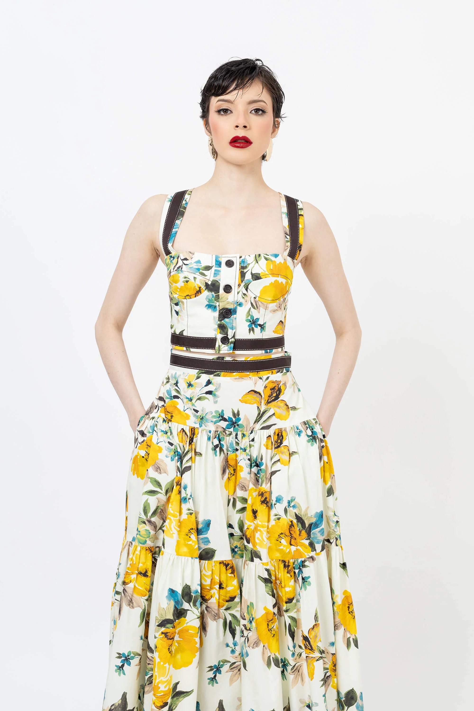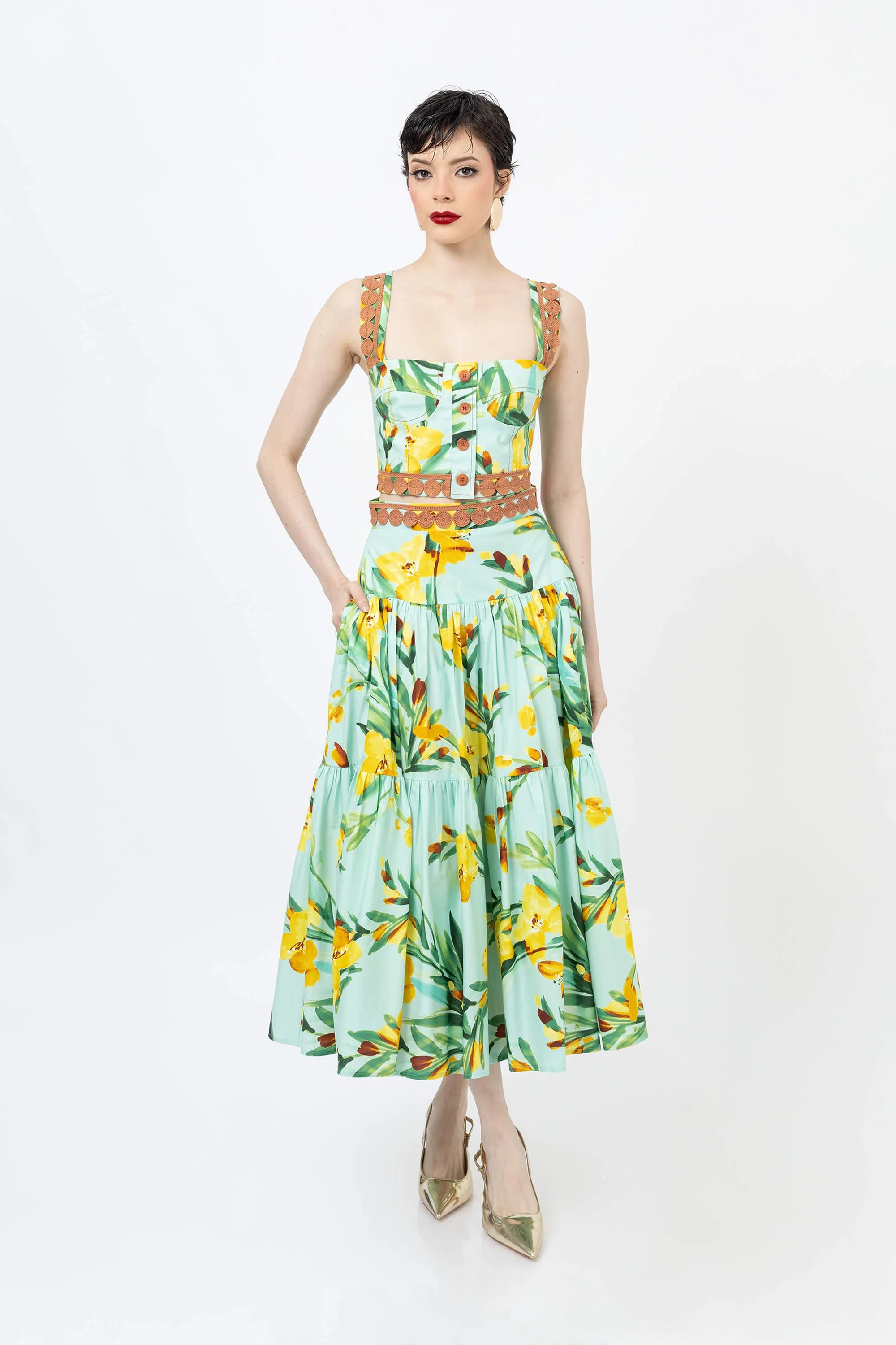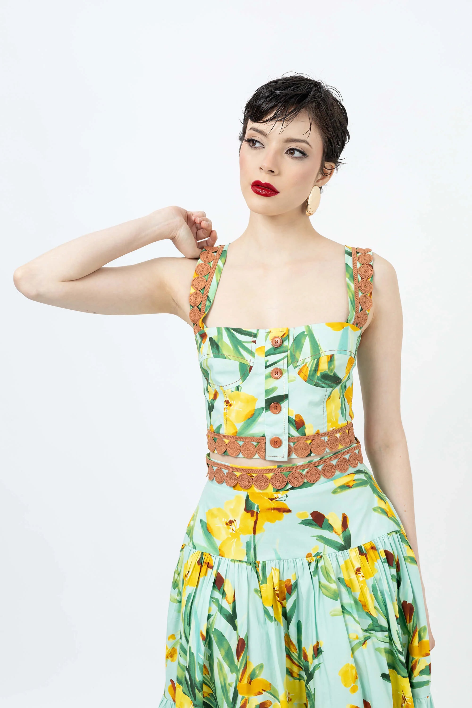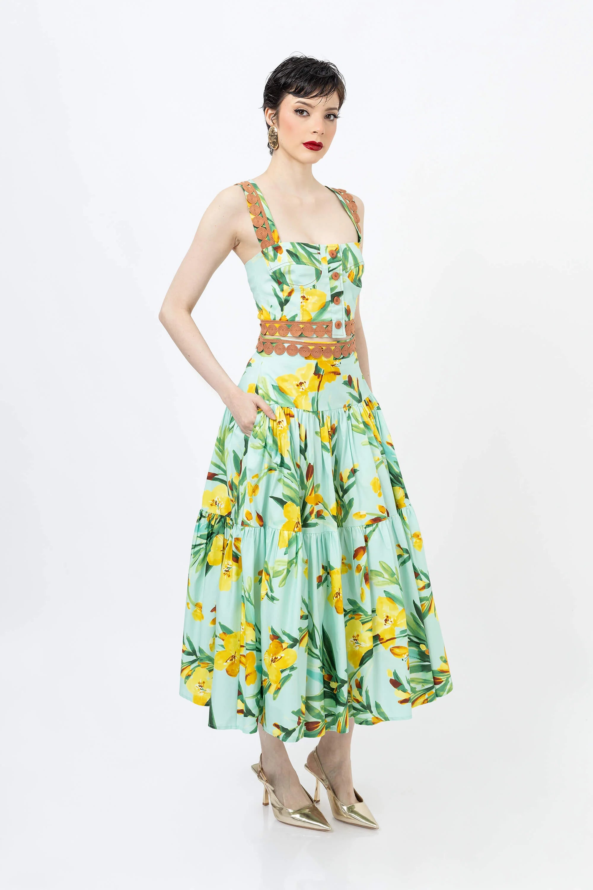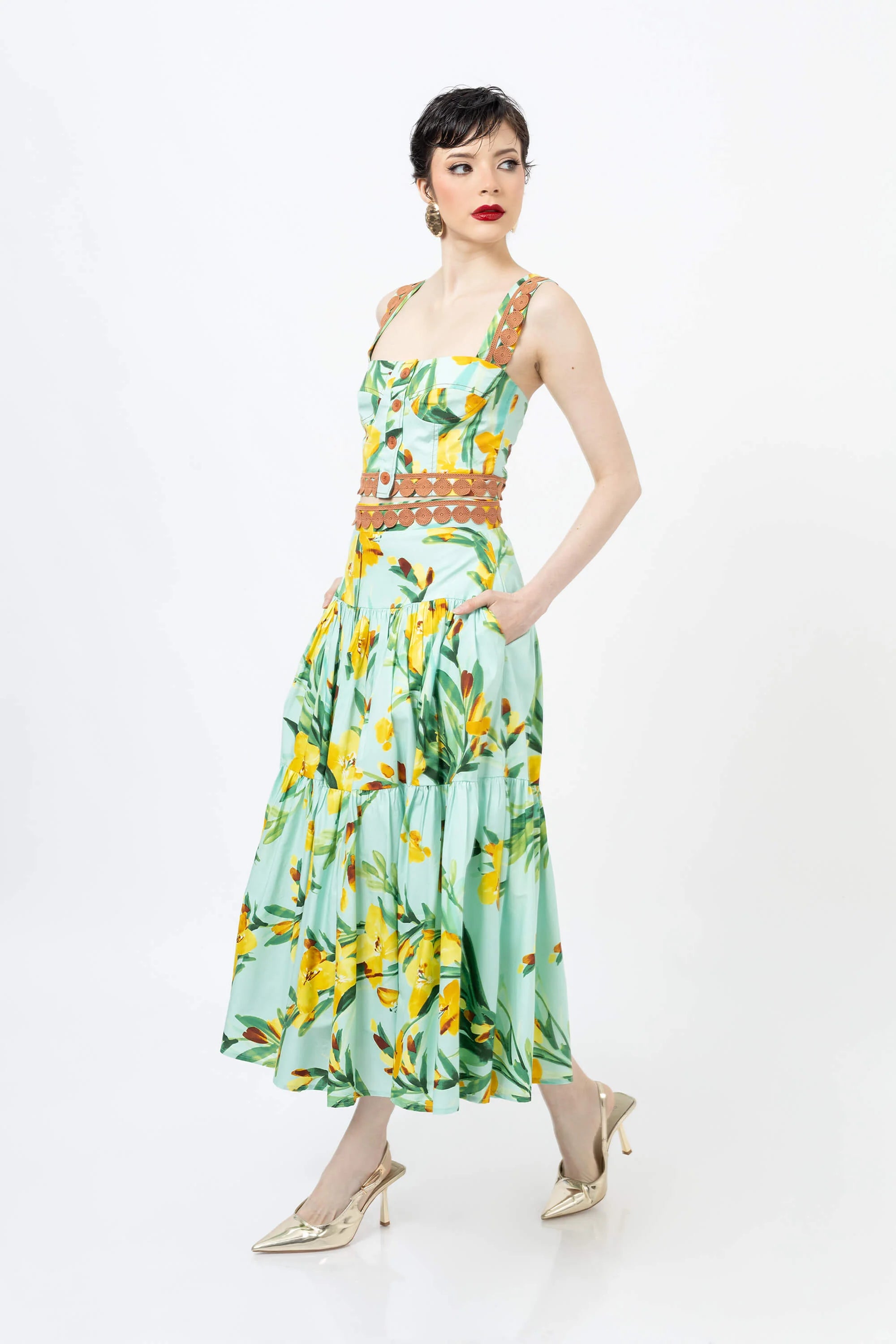 Eleva tu guardarropa de verano con este encantador top corto con un vibrante estampado floral. Confeccionado en un tejido ligero y transpirable, este top presenta un diseño clásico de tirantes que se ajusta a la cintura, ofreciendo una silueta favorecedora y fresca. El llamativo estampado crea un aspecto vibrante y tropical que capta la atención.