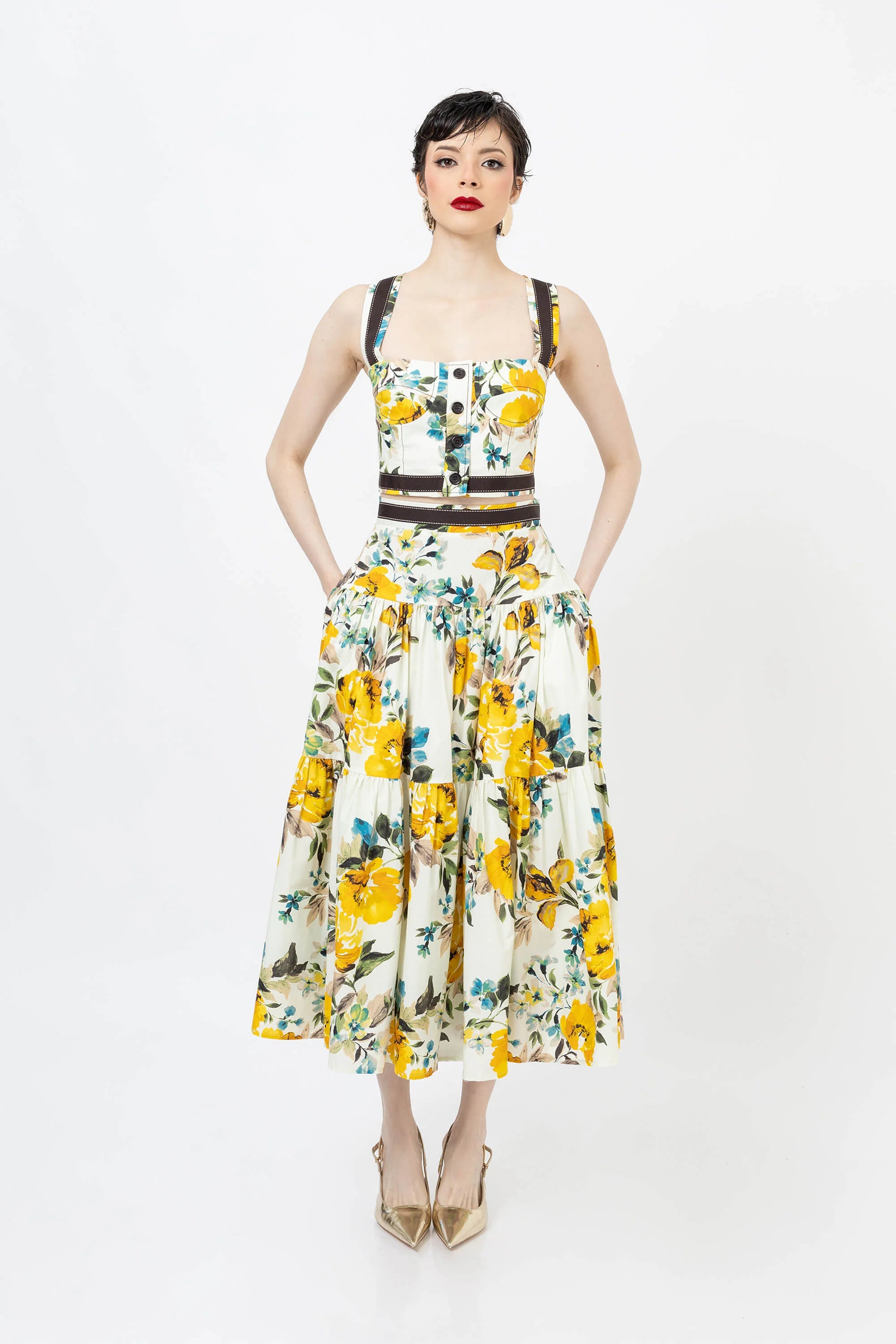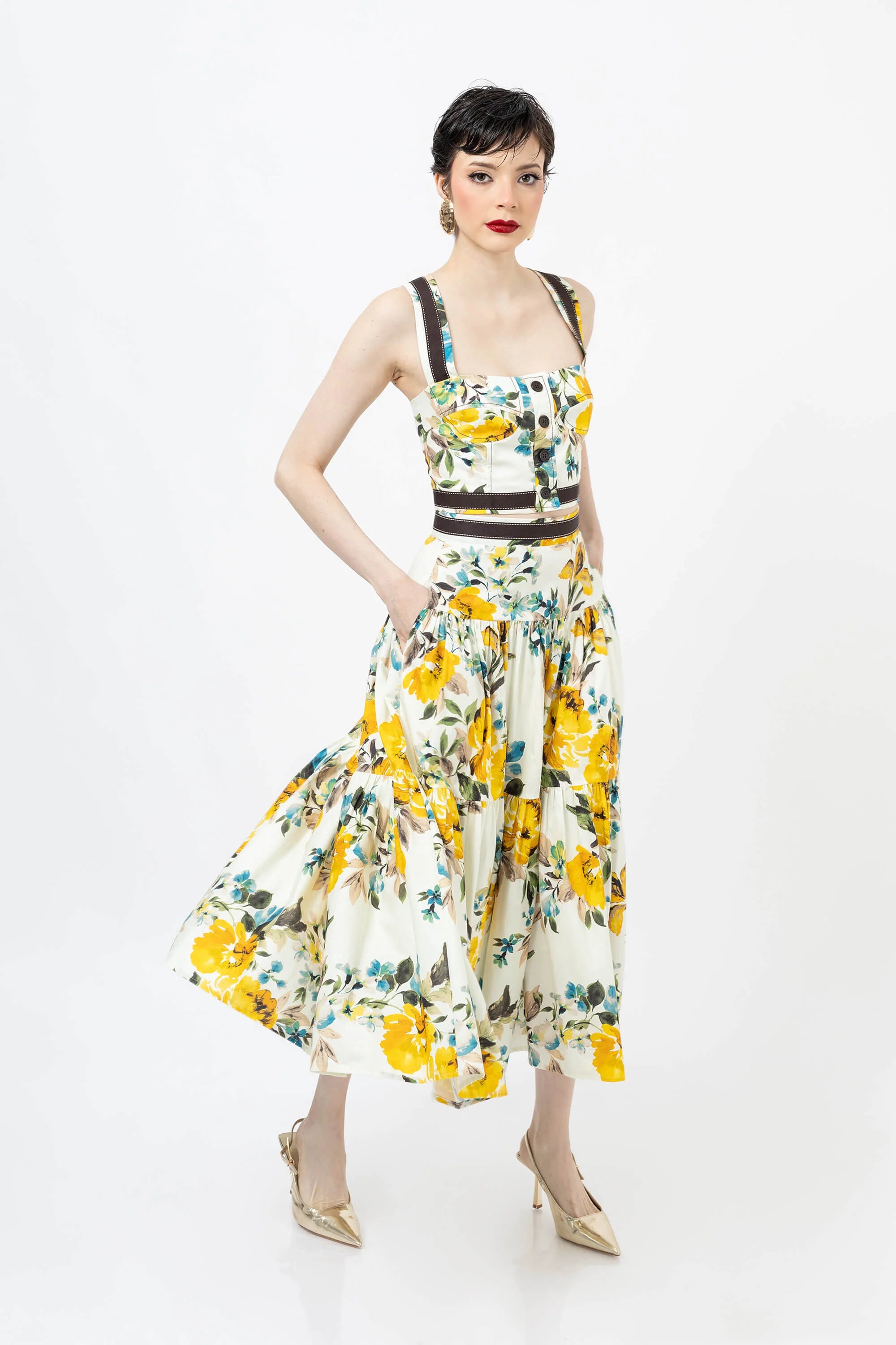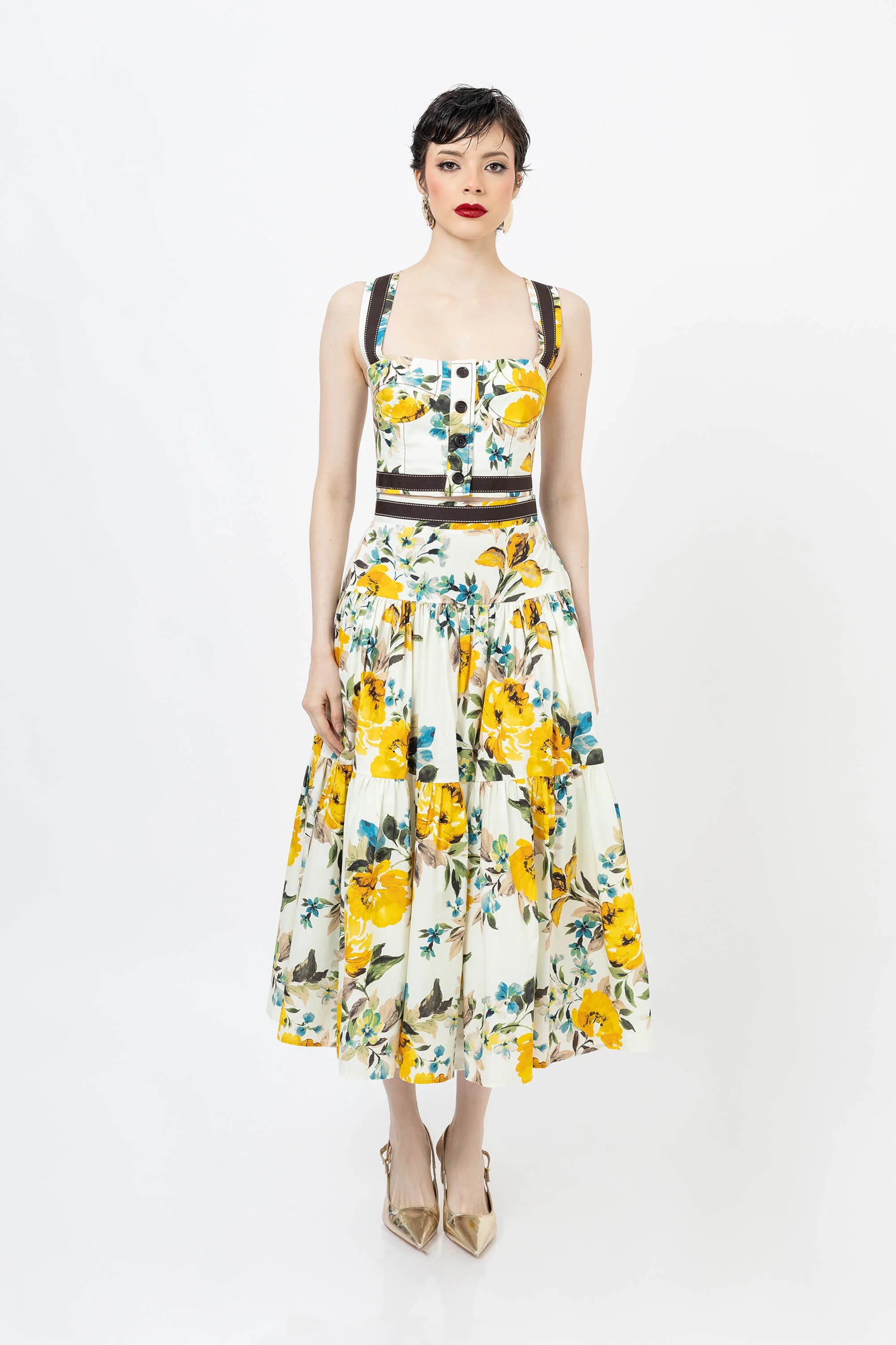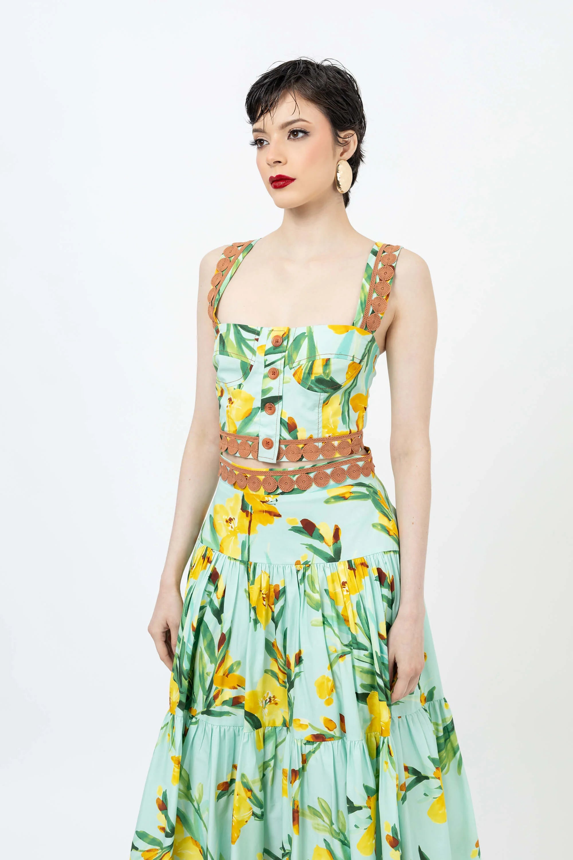Eleva tu guardarropa de verano con este encantador top corto con un vibrante estampado floral. Confeccionado en un tejido ligero y transpirable, este top presenta un diseño clásico de tirantes que se ajusta a la cintura, ofreciendo una silueta favorecedora y fresca. El llamativo estampado crea un aspecto vibrante y tropical que capta la atención.
