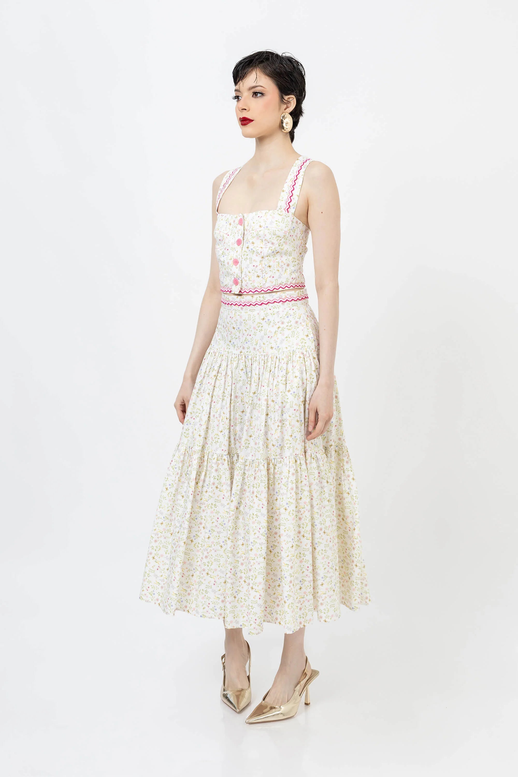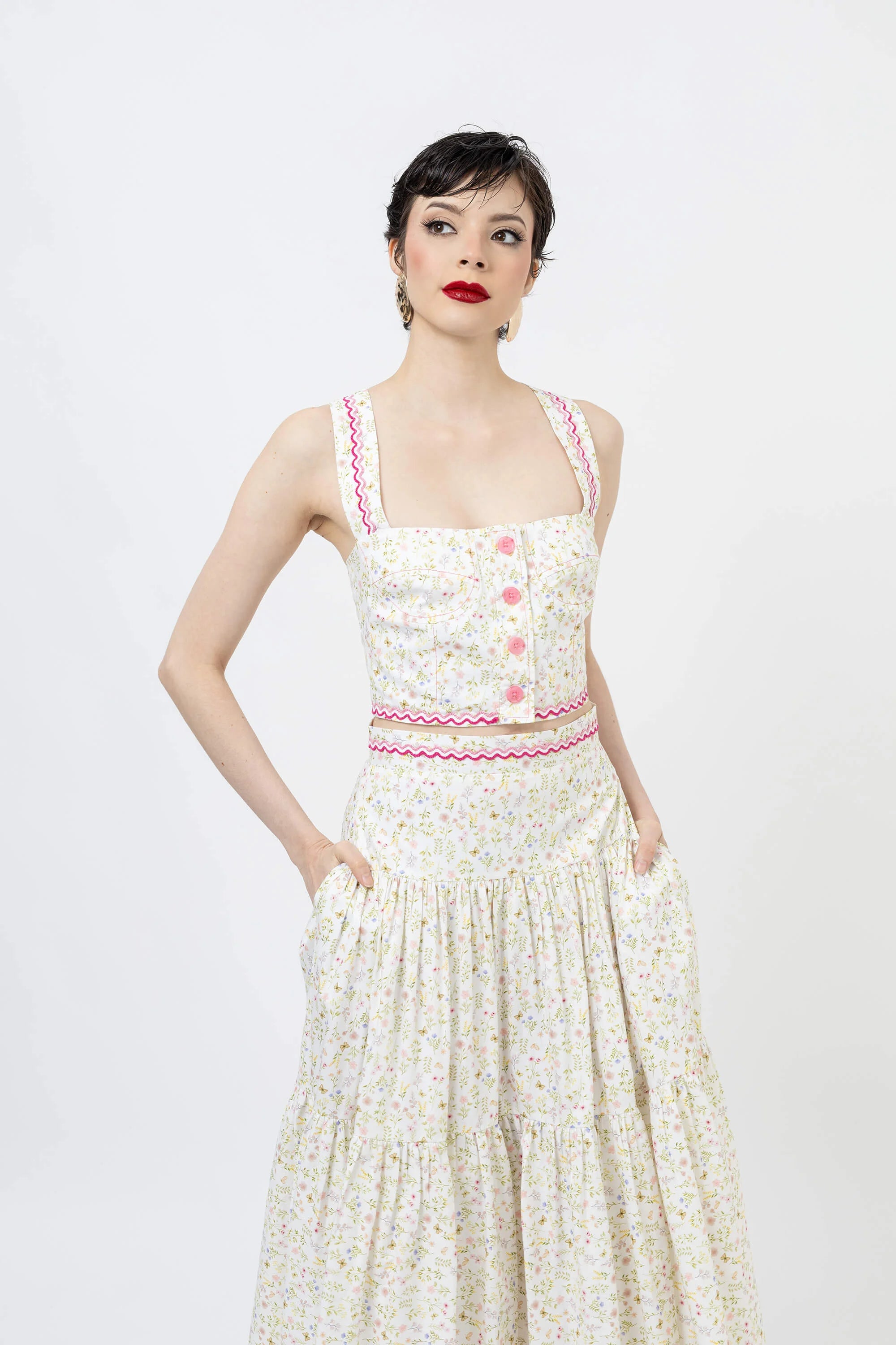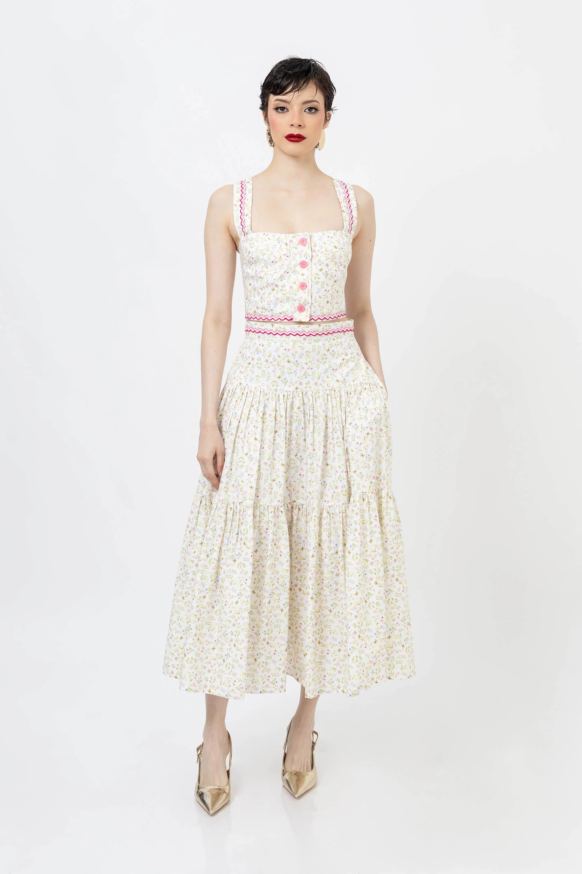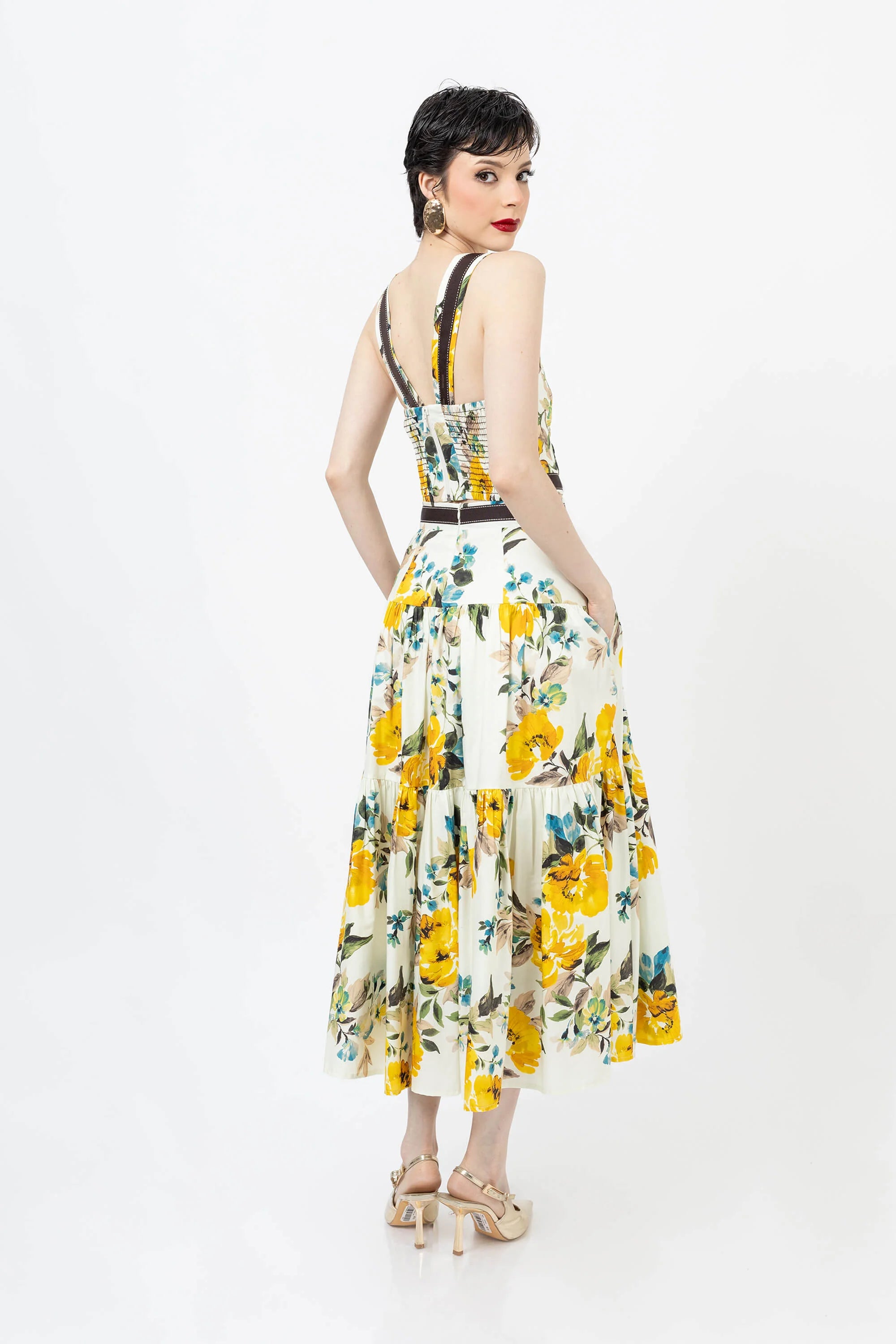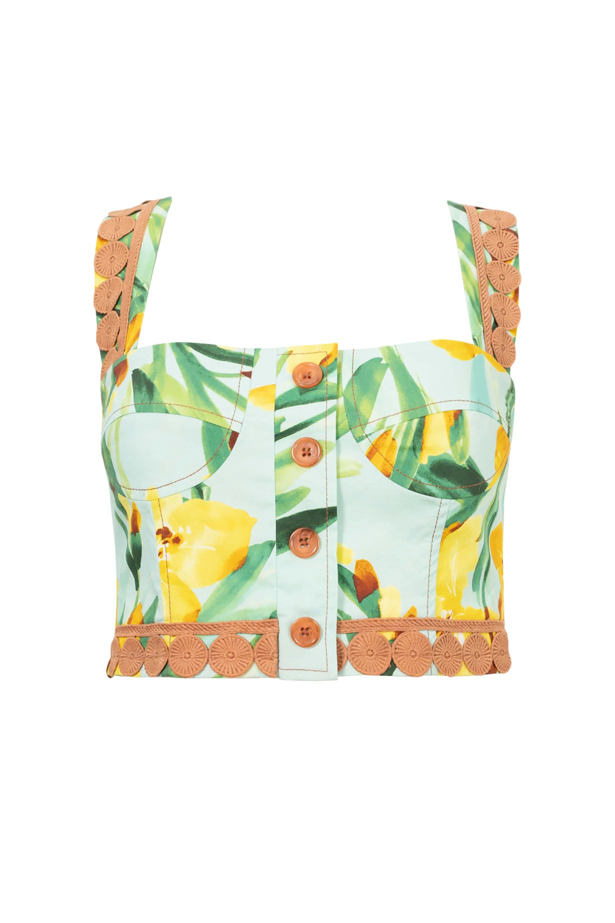 Eleva tu guardarropa de verano con este encantador top corto con un vibrante estampado floral. Confeccionado en un tejido ligero y transpirable, este top presenta un diseño clásico de tirantes que se ajusta a la cintura, ofreciendo una silueta favorecedora y fresca. El llamativo estampado crea un aspecto vibrante y tropical que capta la atención.