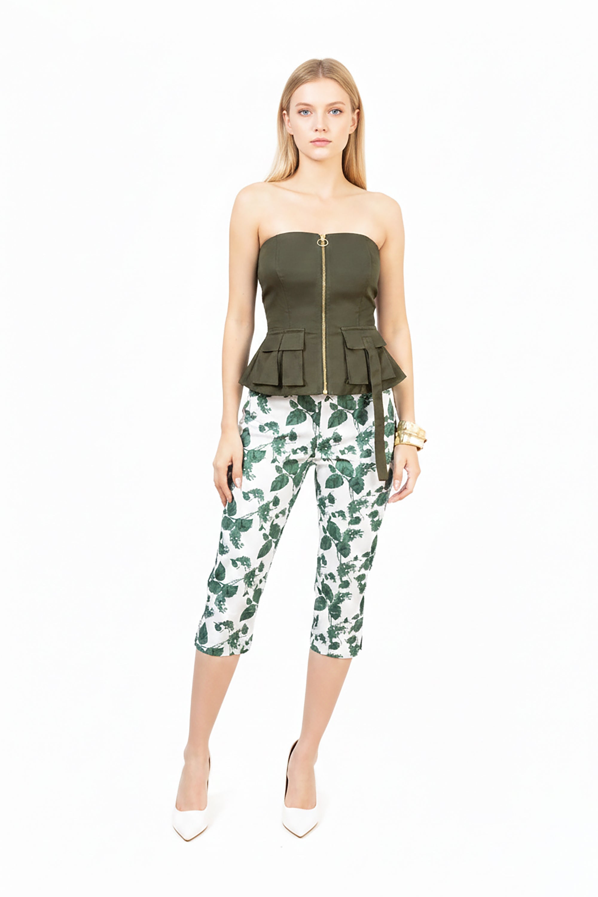 Este pantalón destaca por su impecable silueta de pierna recta y corte cropped, diseñada para estilizar visualmente la figura y proyectar una imagen de frescura sastre moderna. El punto focal de diseño es su talle ultra alto con un panel frontal minimalista, que elimina elementos superfluos para centrarse en la perfección del patronaje y la verticalidad de la prenda. Se caracteriza por incorporar pequeñas aberturas laterales en el bajo, un detalle refinado que aporta movimiento y permite lucir el calzado de forma elegante.