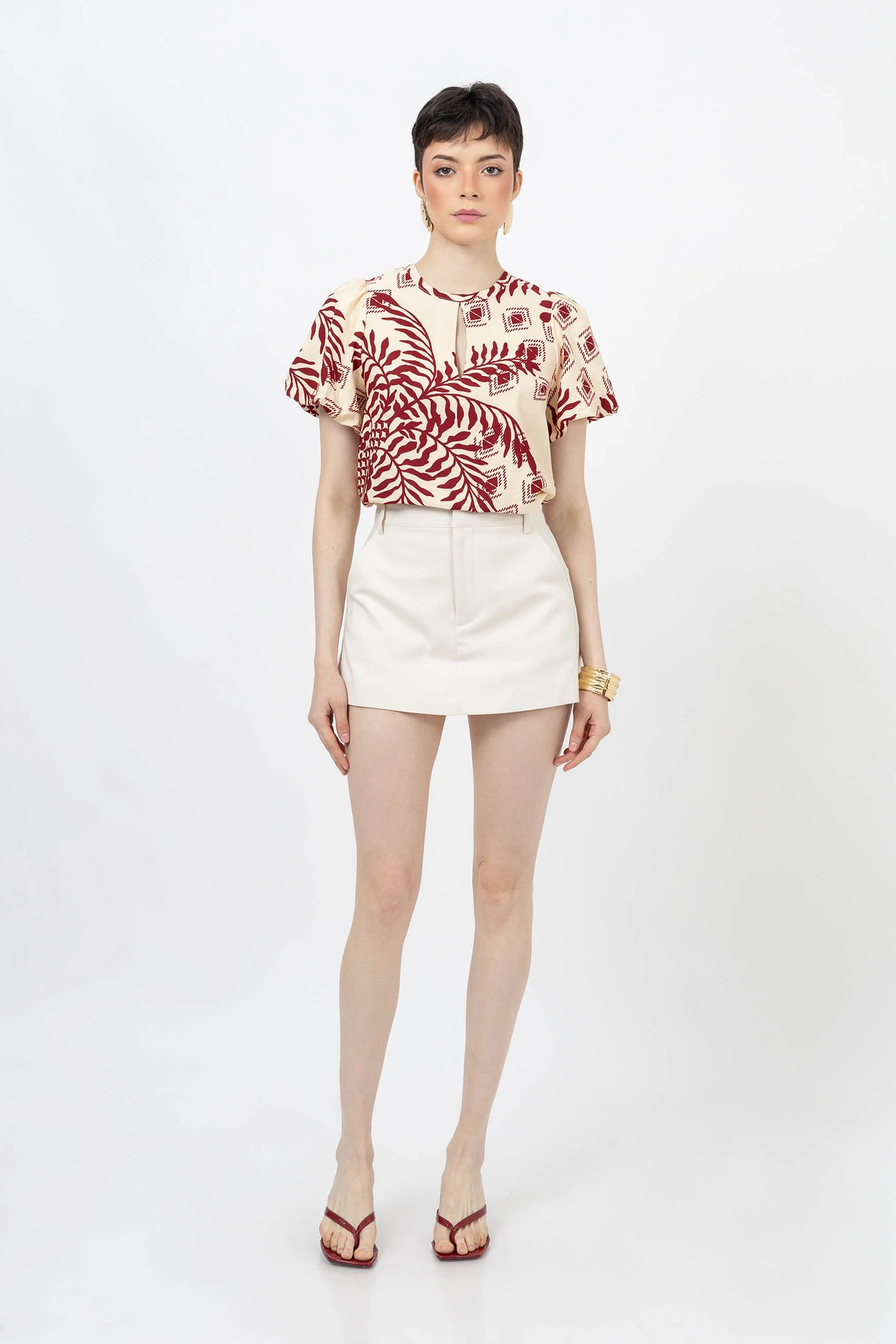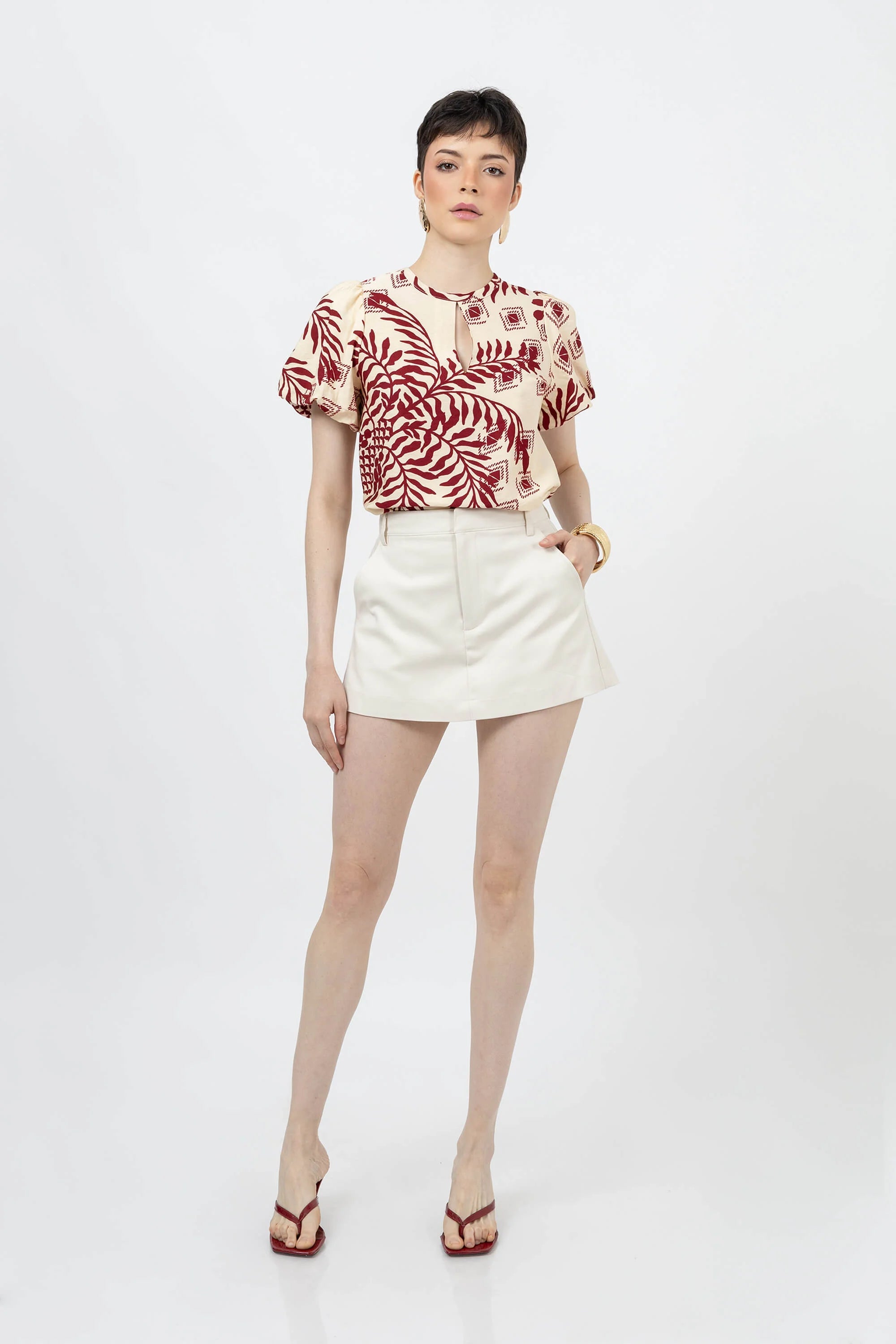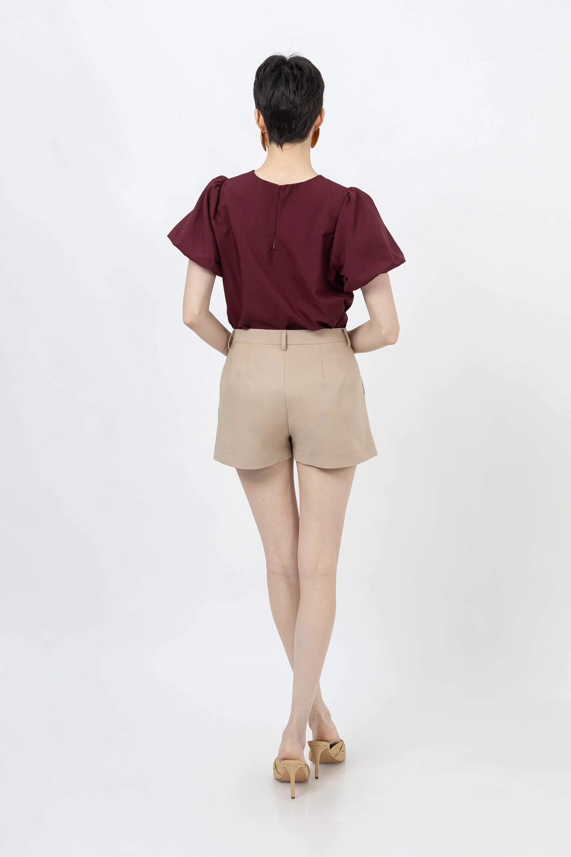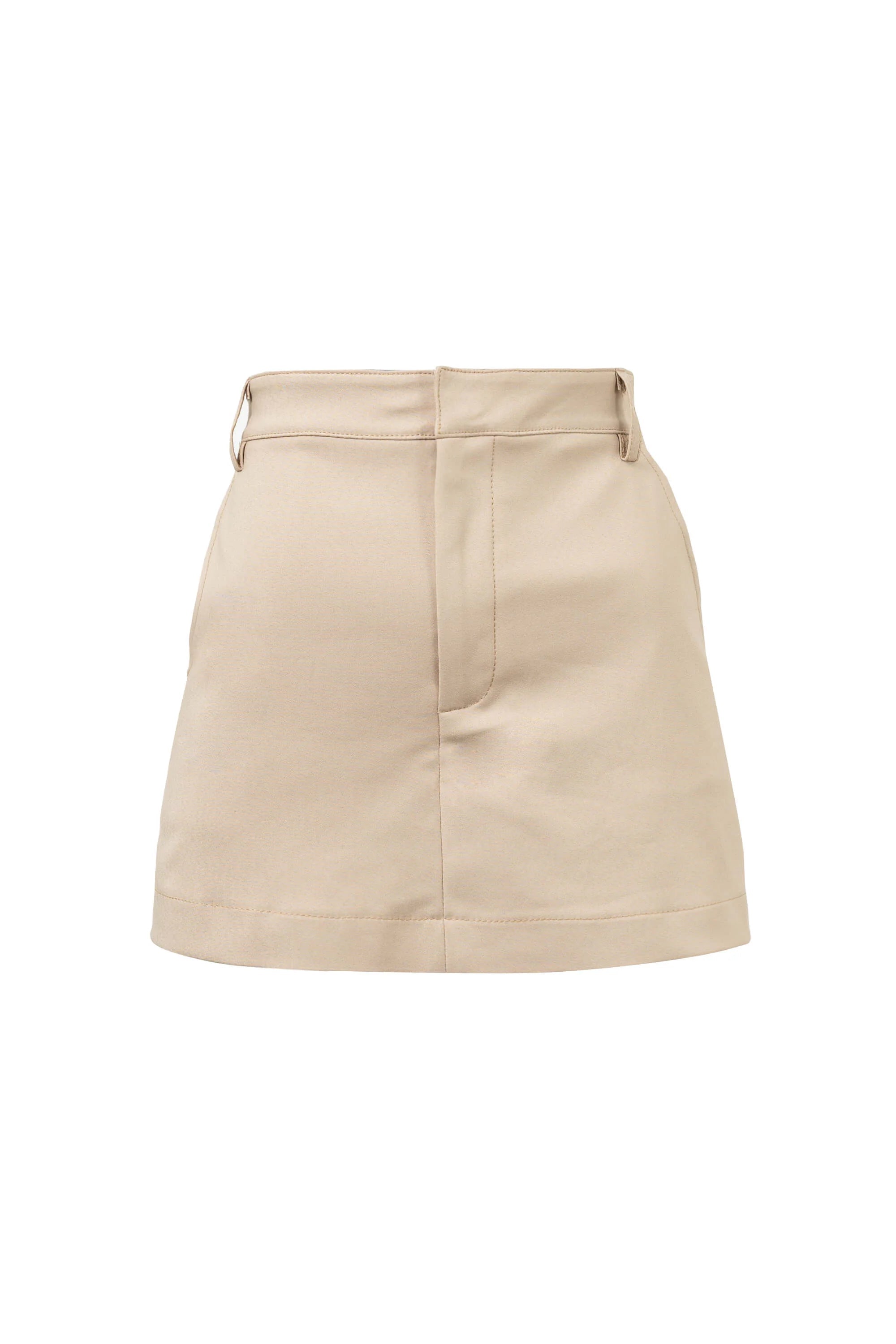 Este short falda de talle alto es la evolución del básico de sastrería, fusionando la elegancia de una minifalda con la seguridad de un pantalón corto. Presenta una silueta frontal limpia y estructurada en tono café tabaco, diseñada con pinzas de entalle que definen la cintura. Su estética híbrida lo convierte en la pieza clave para un estilismo pulido que no compromete la libertad de movimiento.