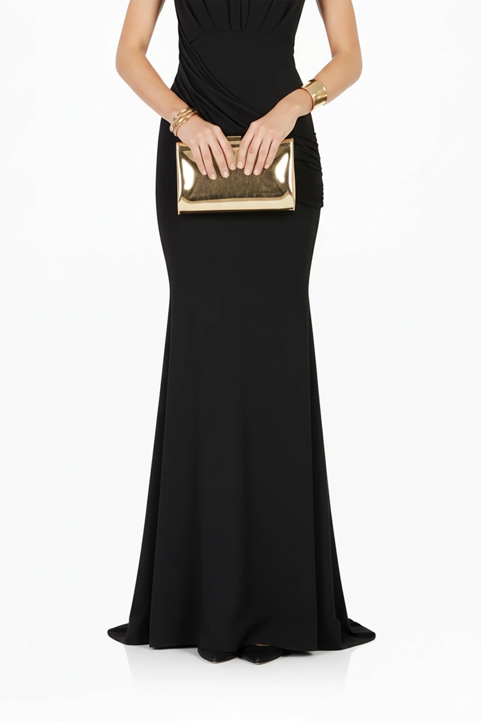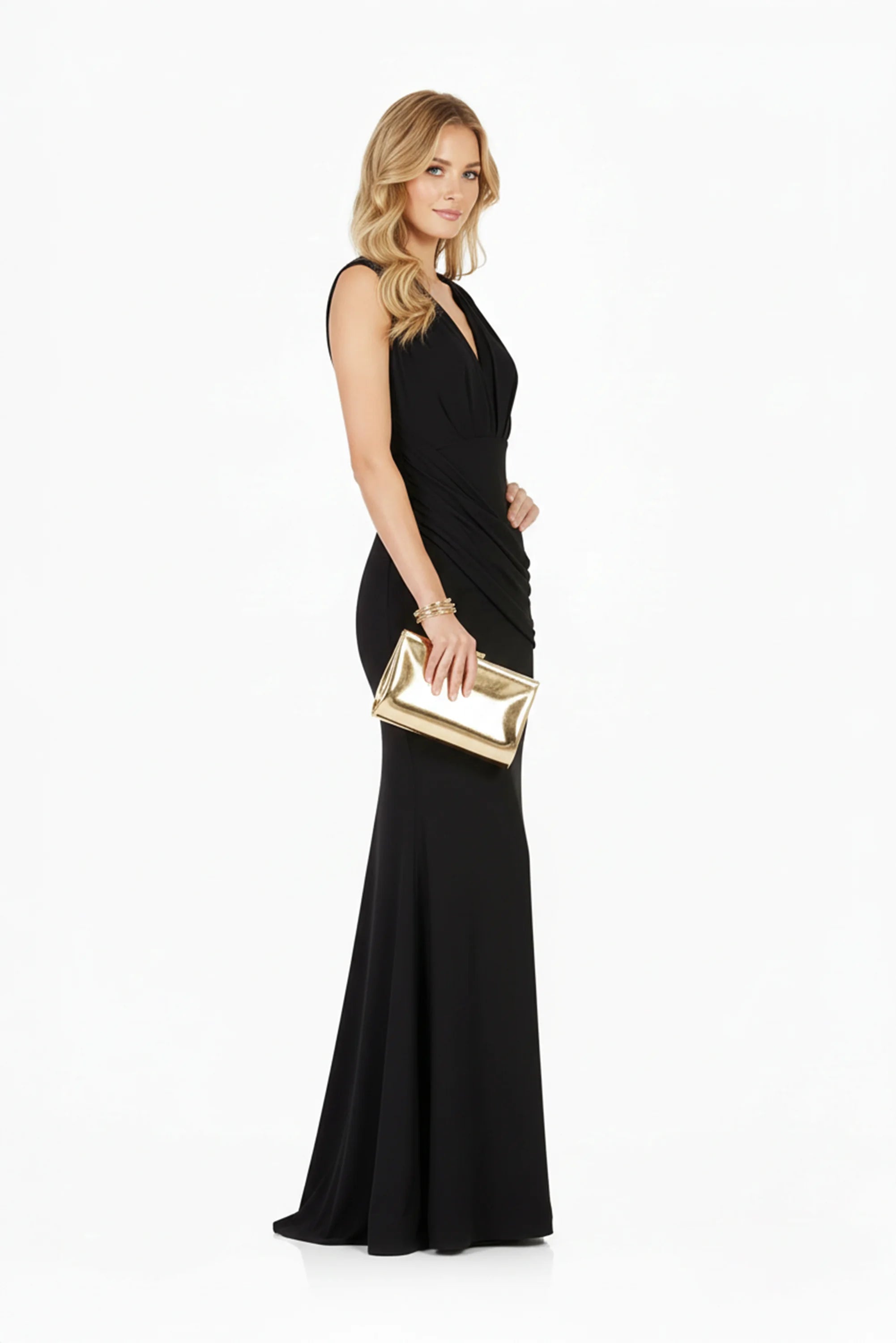 Vestido largo con escote cruzado y detalles en pliegues en color negro.