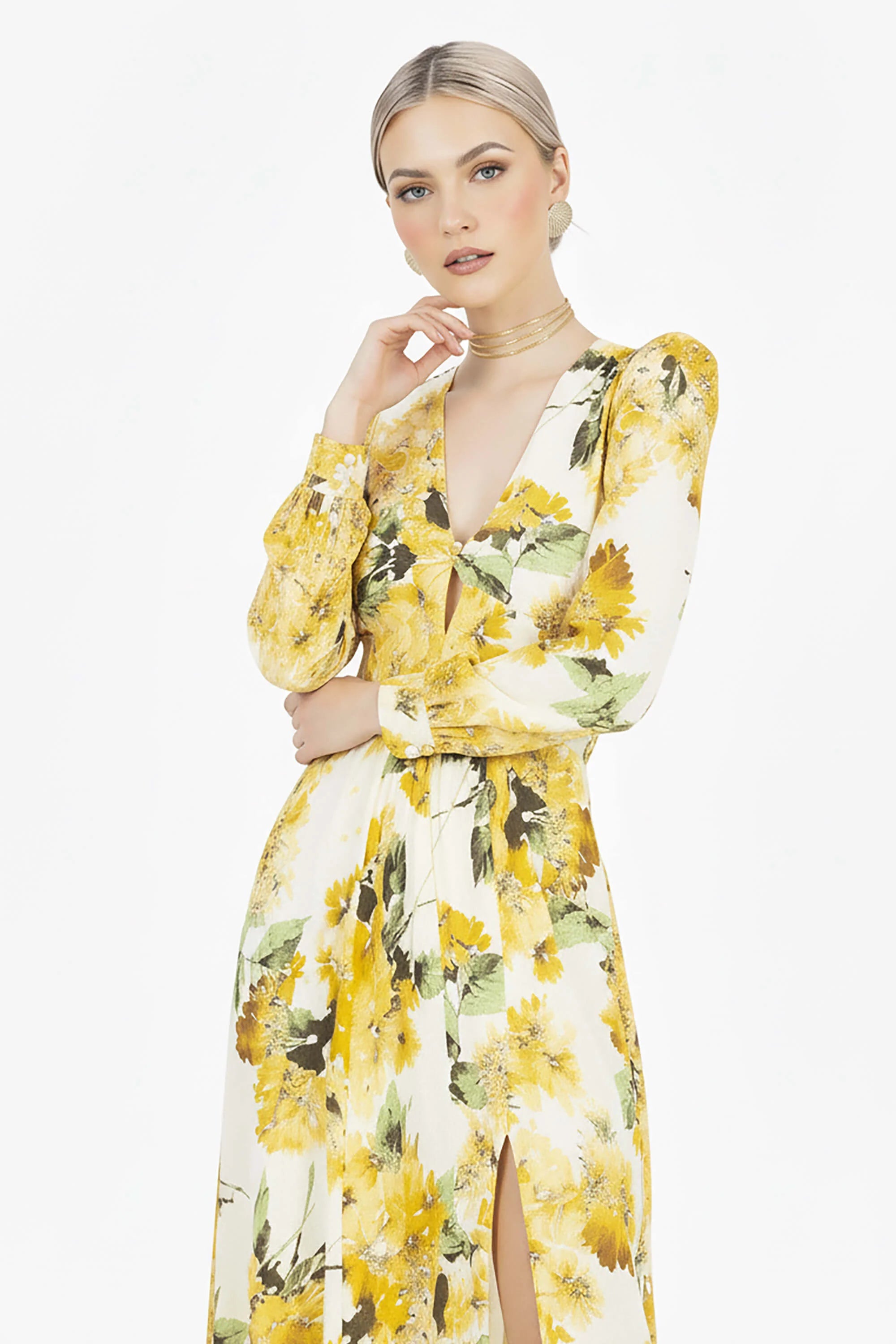 El vestido maxi de rayón con escote en V, manga larga y cinto es una expresión sublime de elegancia atemporal y lujo artesanal. Su silueta fluida, confeccionada en rayón de caída ligera, envuelve el cuerpo con naturalidad, mientras el estampado floral en tonos cálidos evoca paisajes llenos de luz y sofisticación.