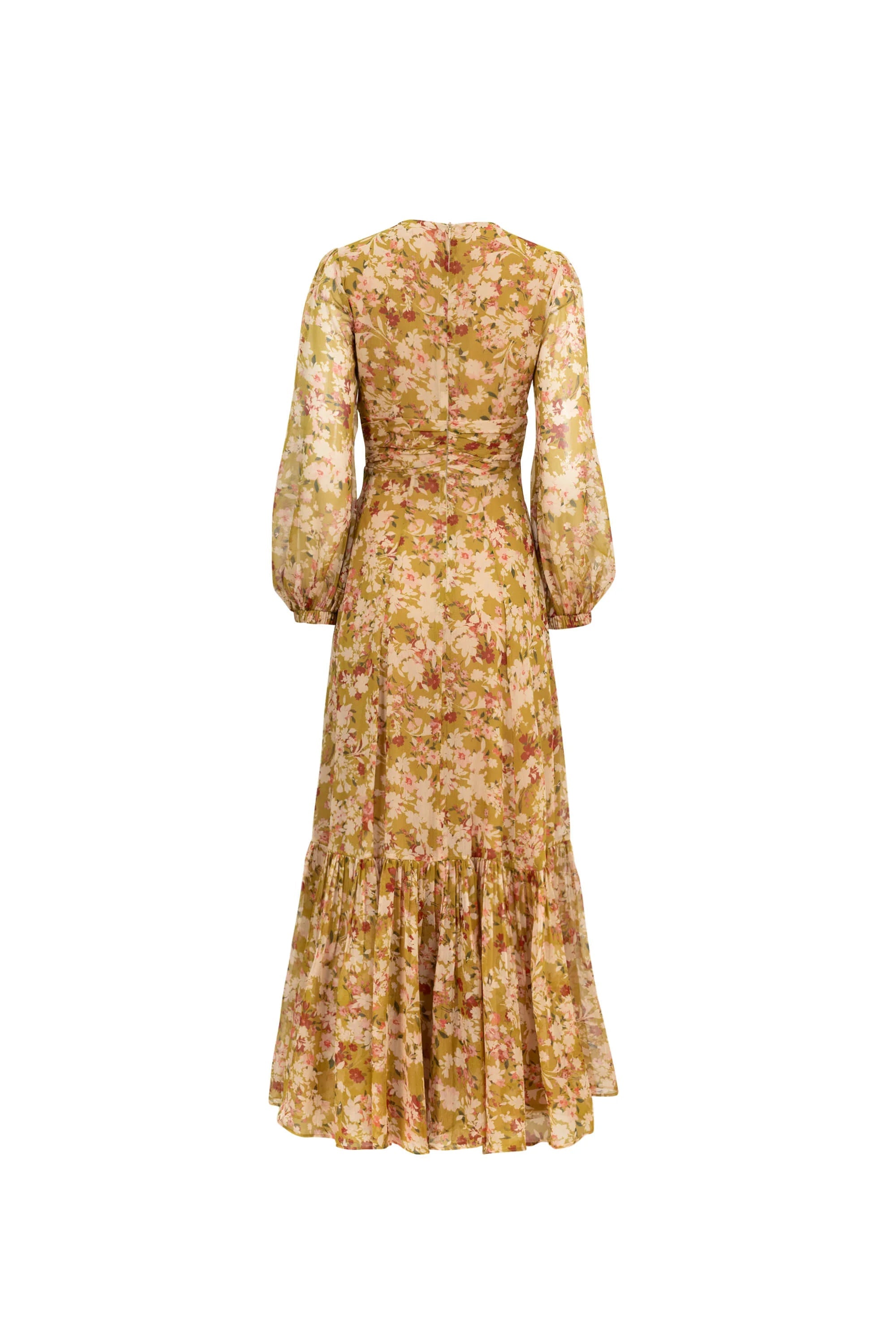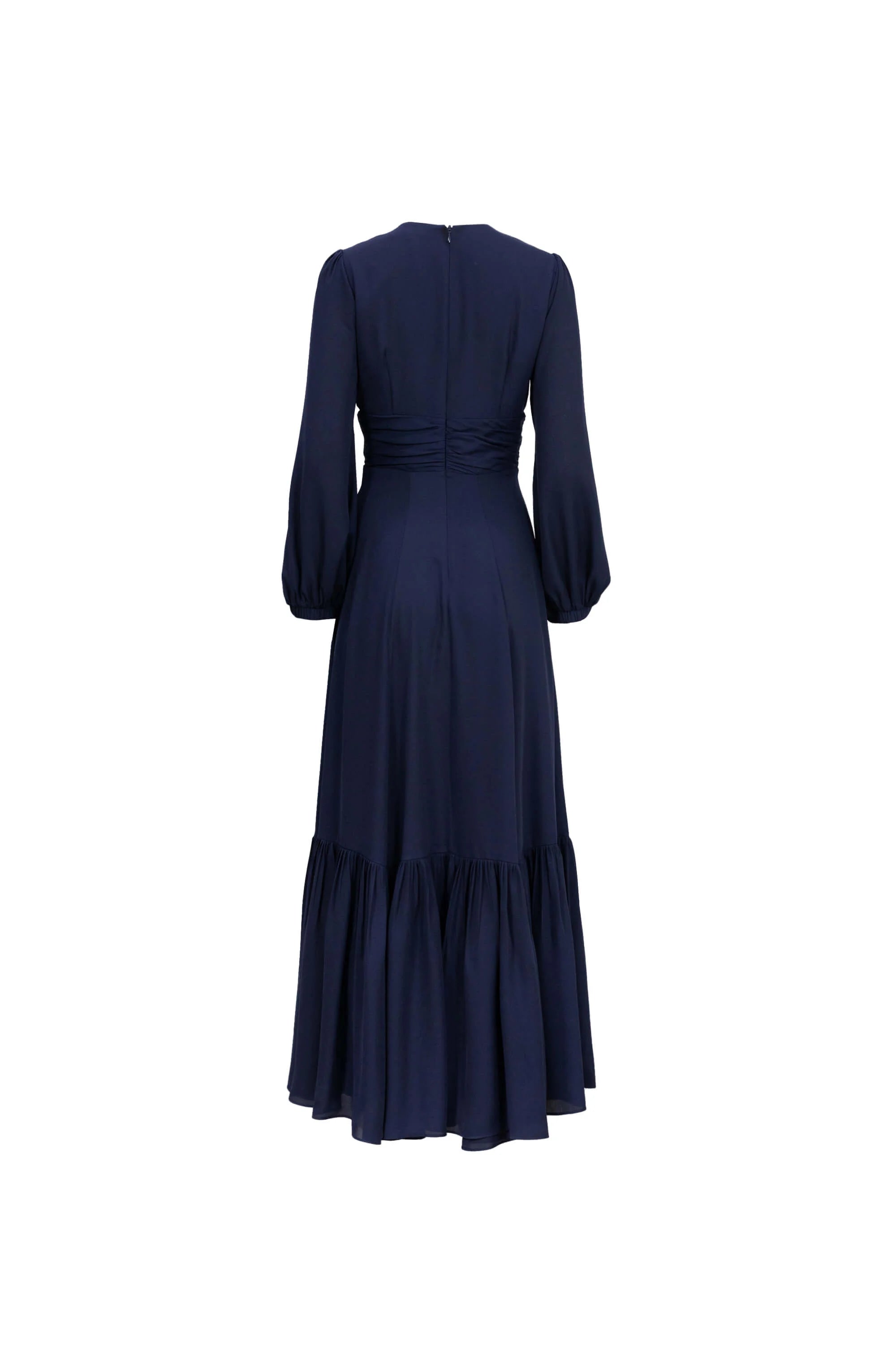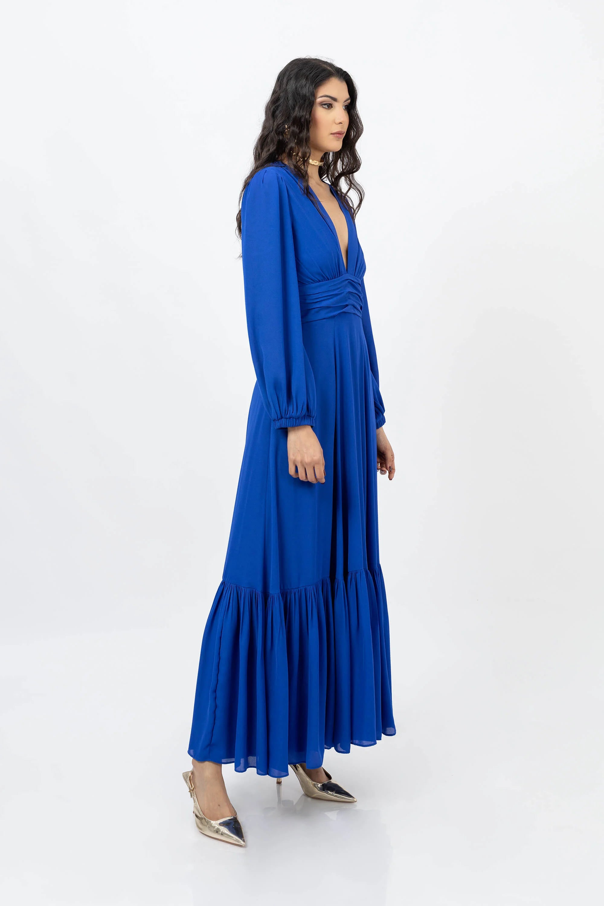 Vestido maxi con olán en ruedo y manga larga bishop | Reina Díaz