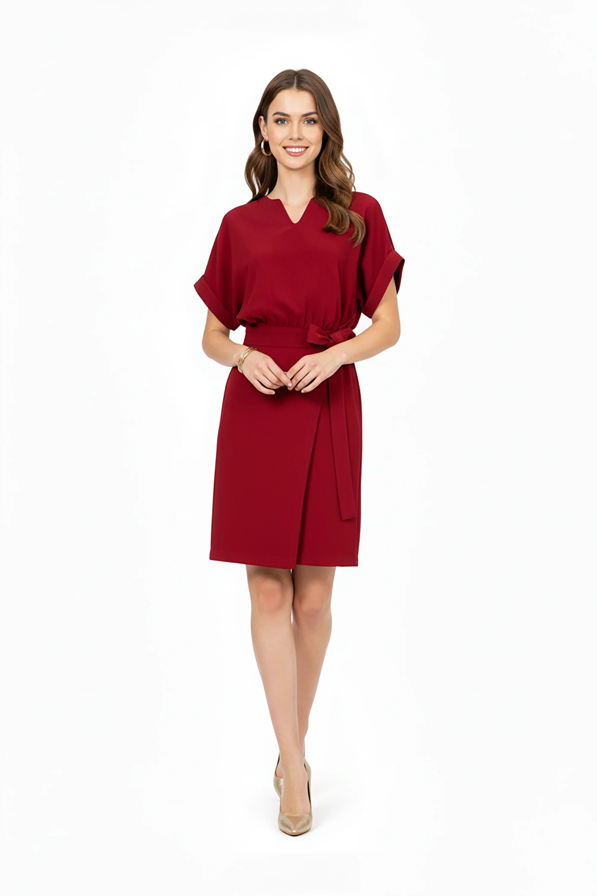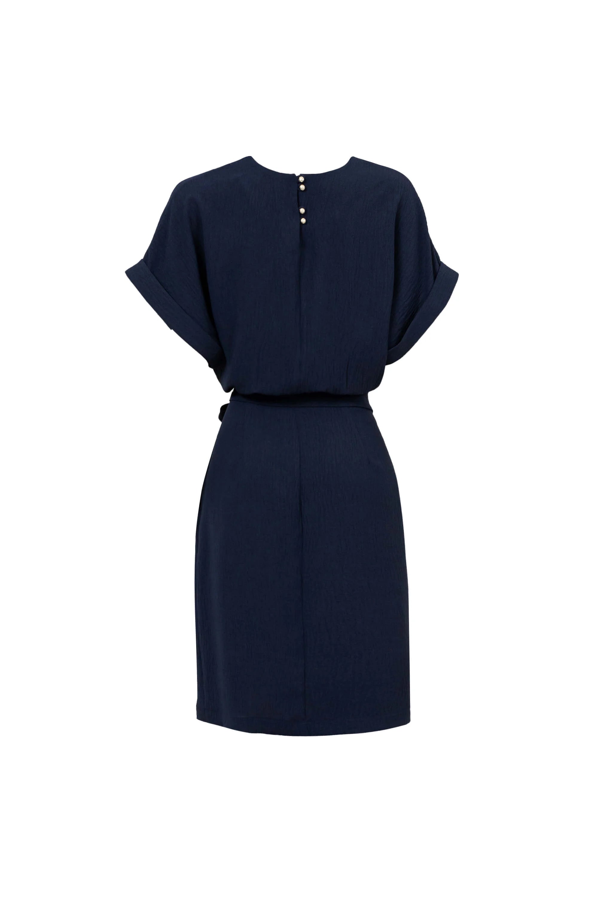 Vestido corto de manga corta con diseño sencillo y elegante. Presenta escote en V, cintura ceñida con cinturón del mismo tejido y falda recta que cae por encima de la rodilla. La parte superior tiene un ajuste ligeramente suelto que aporta comodidad, mientras que el cinturón define la silueta y añade un detalle decorativo. Las mangas con vuelta en el puño y el tejido ligero con textura discreta lo convierten en una prenda versátil para ocasiones casuales o semi-formales.