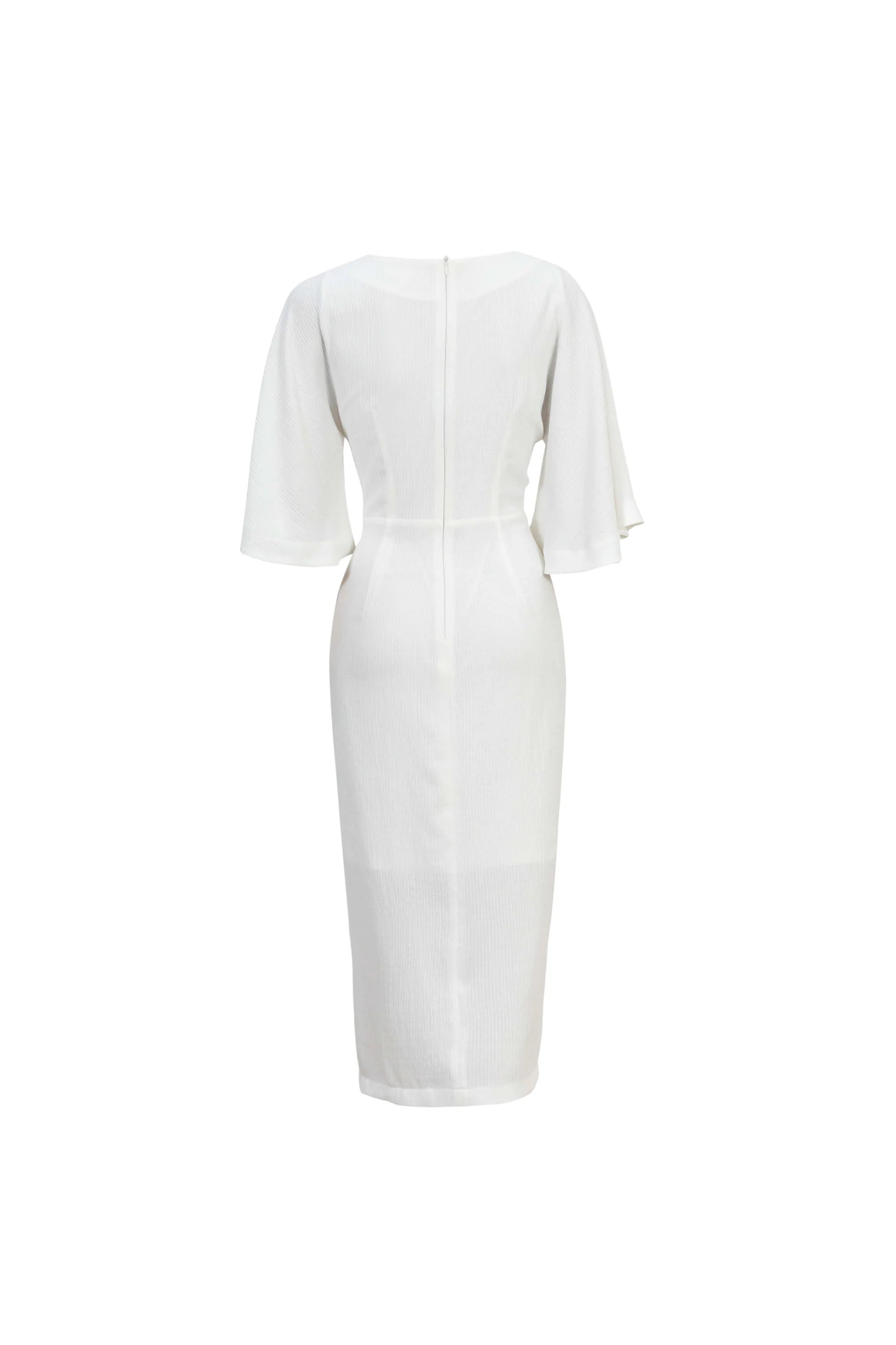 Vestido cruzado blanco con diseño elegante y minimalista. Una prenda versátil que combina comodidad y sofisticación, ideal para ocasiones semi-formales y eventos especiales.