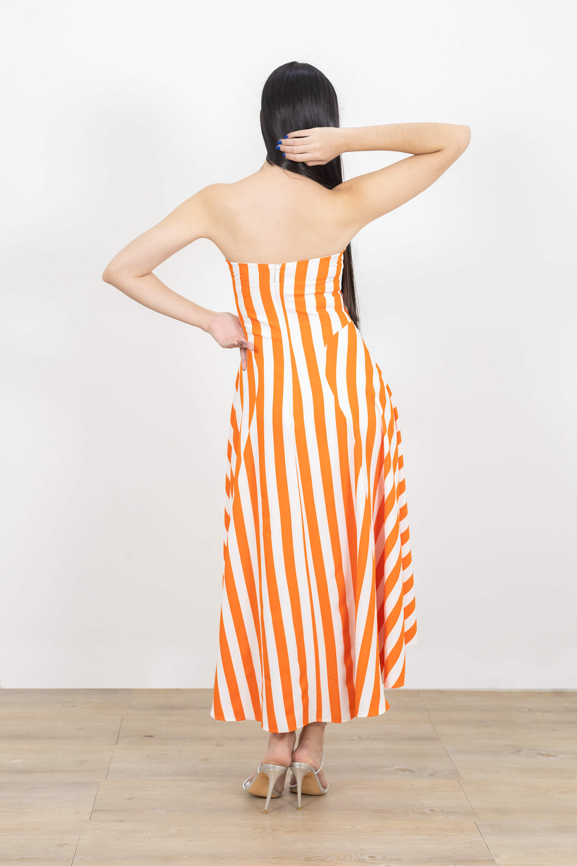 Vestido midi de twill strapless, asimétrico