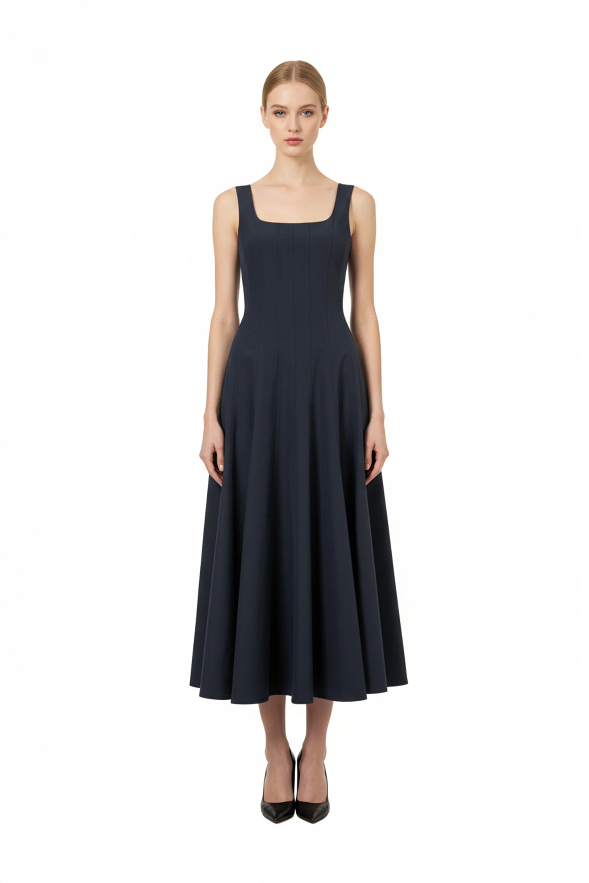 Vestido sin mangas con silueta estructurada y corte clásico. Presenta escote cuadrado y costuras verticales que estilizan la figura, mientras que la falda amplia en línea A aporta movimiento y volumen. El tejido de peso medio asegura caída definida y un acabado elegante. Su diseño evoca un estilo retro con un aire sofisticado, ideal para ocasiones formales, semi-formales o eventos especiales.