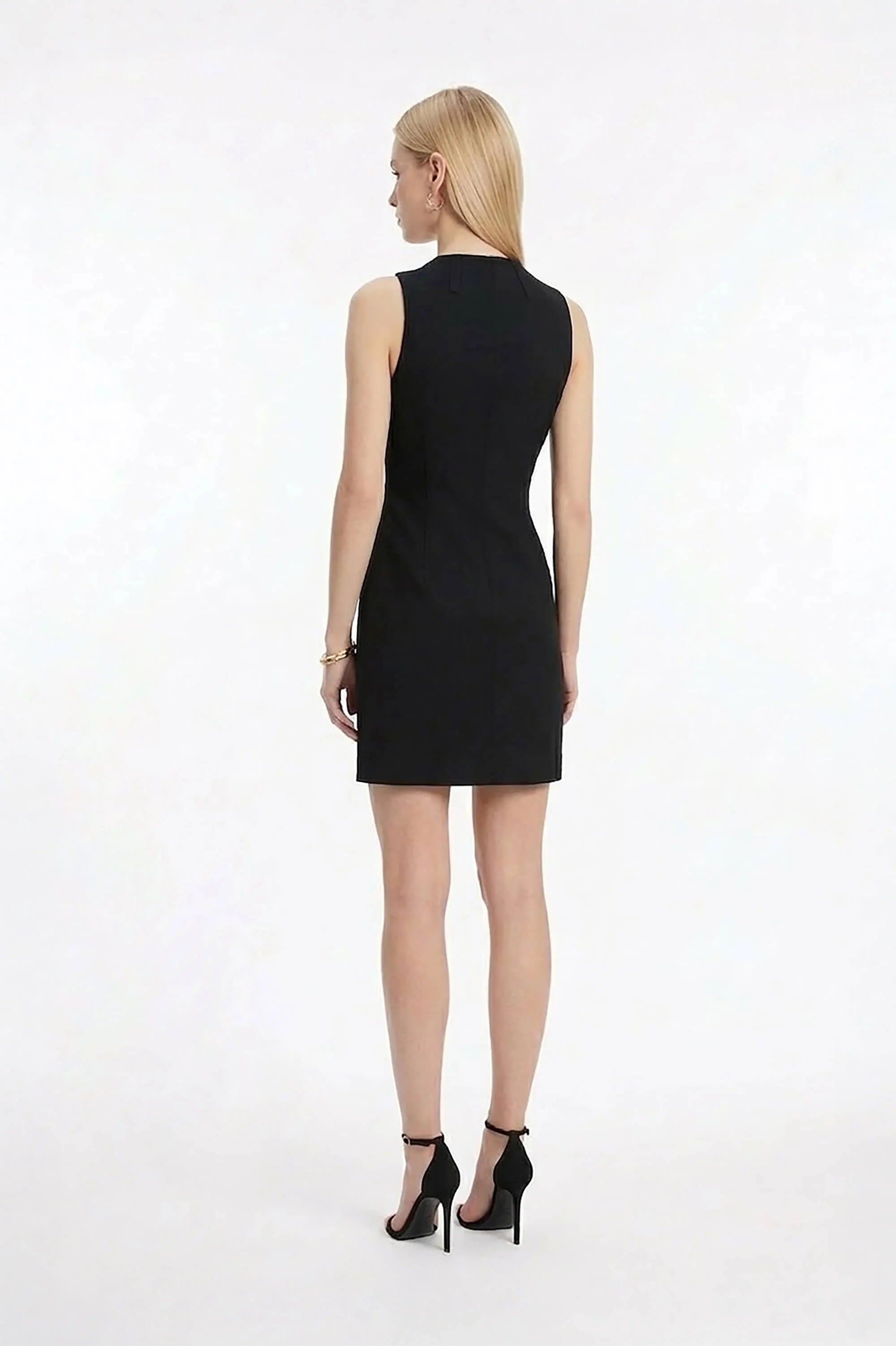 El diseño presenta una estructura limpia y minimalista, enriquecida con cortes estratégicos que delinean la figura y aportan un toque arquitectónico. Los pespuntes vivos no solo añaden un detalle visual distintivo, sino que también enfatizan las líneas del diseño, elevando su acabado a un nivel más refinado.