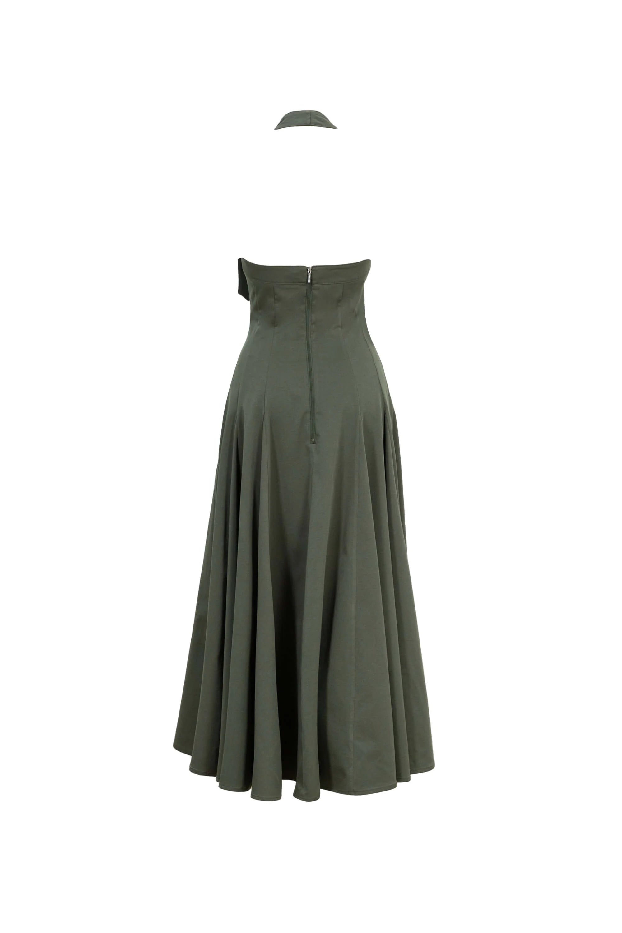 Vestido verde halter con diseño elegante y falda amplia. Una prenda sofisticada y versátil que combina estilo moderno con un aire clásico, ideal para ocasiones formales o semi-formales