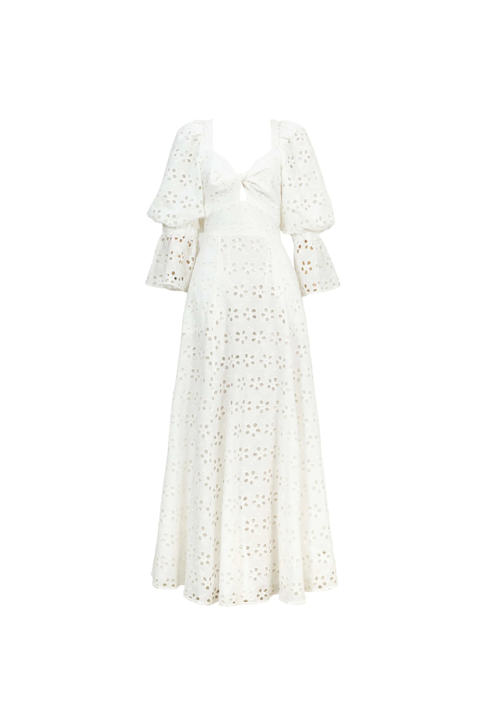 Vestido largo blanco de encaje con mangas abullonadas y detalle cut-out en el busto. Una prenda romántica y sofisticada que combina estilo vintage con un aire moderno, ideal para ocasiones especiales